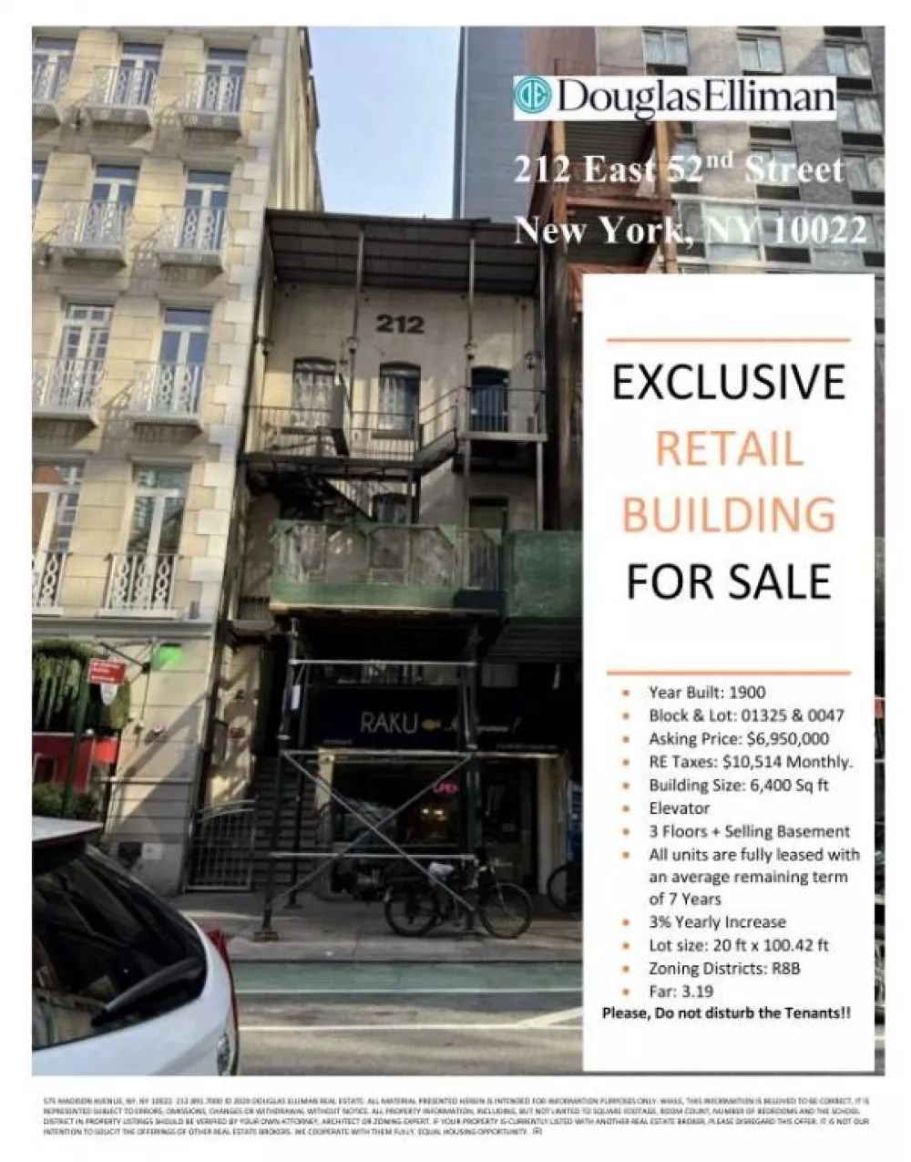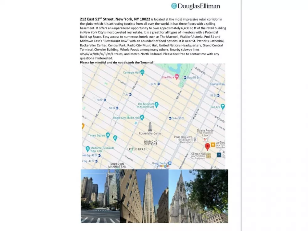 212 East 52nd Street, New York, NY 10022 is located at the most impressive retail corridor in the globe which it is attracting tourists from all over the world. It has three floors with a selling basement. It offers an unparalleled opportunity to own approximately 6,400 sq ft of the retail building in New York City's most coveted real estate. It is a great for all types of investors with a Potential Build-up Space. Easy access to numerous hotels such as The Maxwell, Waldorf Astoria, Pod 51 and Midtown East's "Restaurant Row" with an abundant of food options. It is near St. Patrick's Cathedral, Rockefeller Center, Central Park, Radio City Music Hall, United Nations Headquarters, Grand Central Terminal, Chrysler Building , Whole Foods among many others. Nearby subway lines 4/5/6/W/R/N/Q/F/M/E trains, and Metro-North Railroad. Please feel free to contact me with any questions if interested.