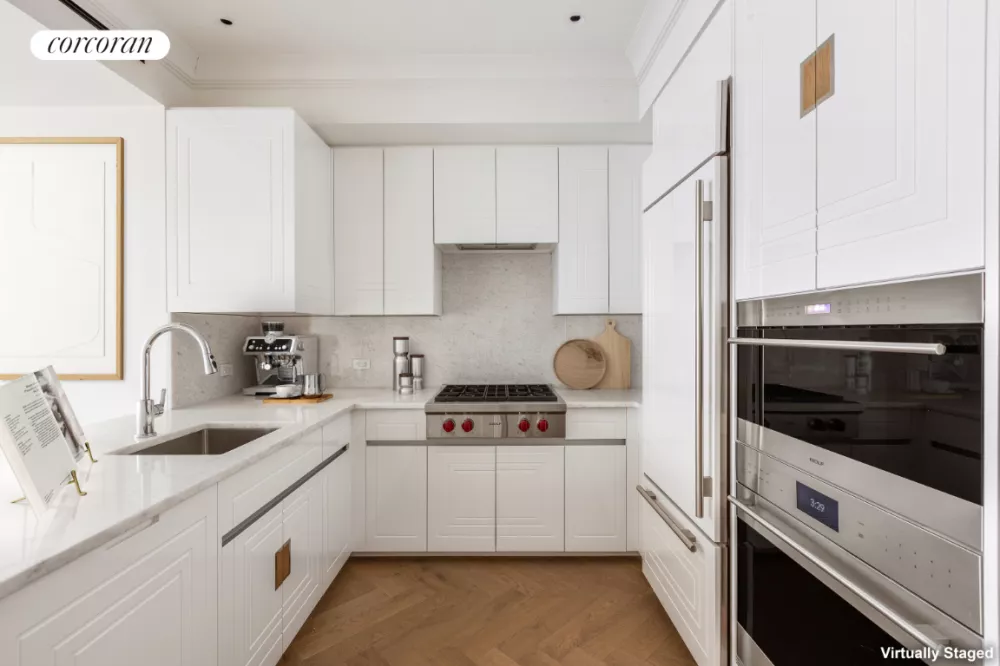 The custom-designed kitchen is perfect for at-home gourmets, with crystal gray calcite slab countertops and backsplashes. Custom white lacquer cabinetry designed with an Art Deco-inspired geometric relief pattern including an inset stainless steel detail. Appliances are integrated into the custom cabinetry, including a Sub-Zero refrigerator and wine storage, a Wolf gas range with an outside vented hood, an additional Wolf speed oven, and an integrated Cove dishwasher.