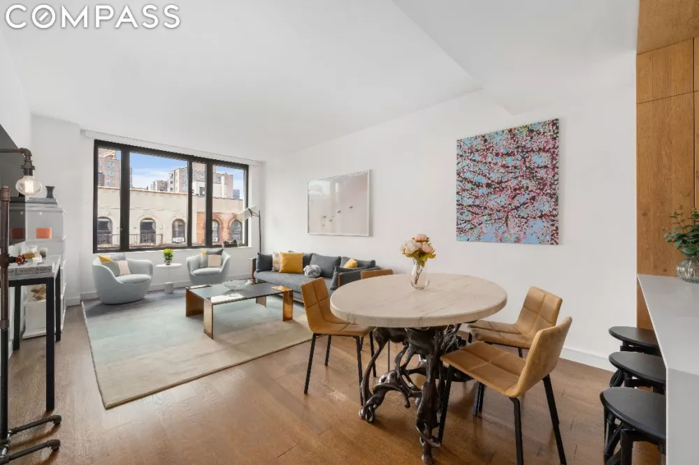 The entry foyer flows directly into a large over 21’ living room. Natural light bathes the interior through expansive high-performance double-paned windows which face south and frame the open sky, lush greenery, and architectural cornices across East 13th Street.