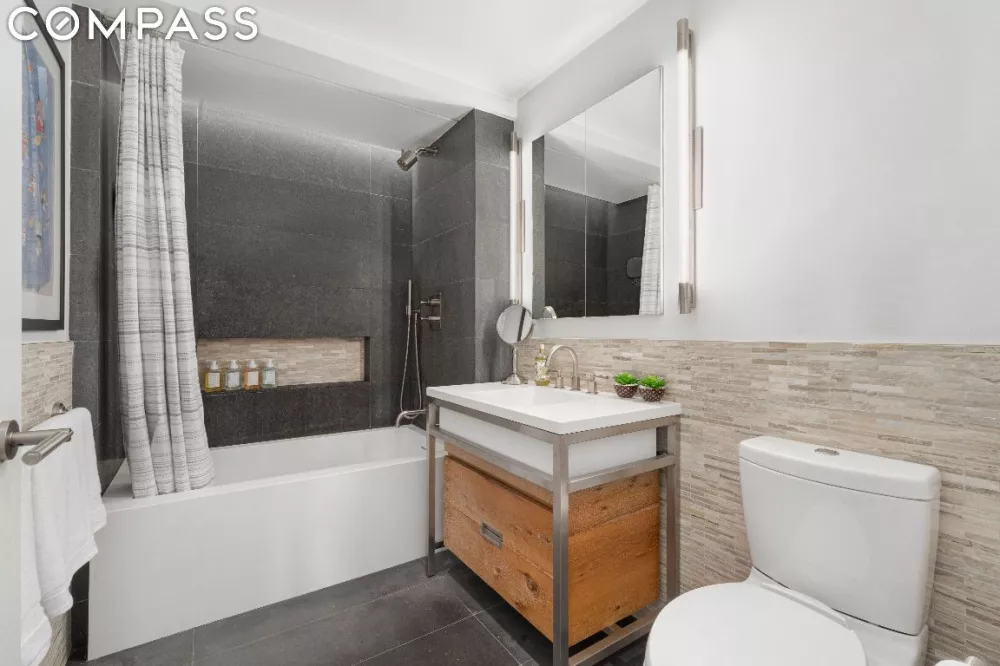 The sizable bright bedroom also faces south and features a large linear closet. An adjacent well-appointed bathroom is outfitted with an oversized Corian soaking tub, radiant heated Basaltina stone floor, honed limestone walls, a Corian and reclaimed barn wood vanity, a GlassCrafters two-door medicine cabinet, and premium fixtures by LeFroy Brooks and Restoration Hardware.