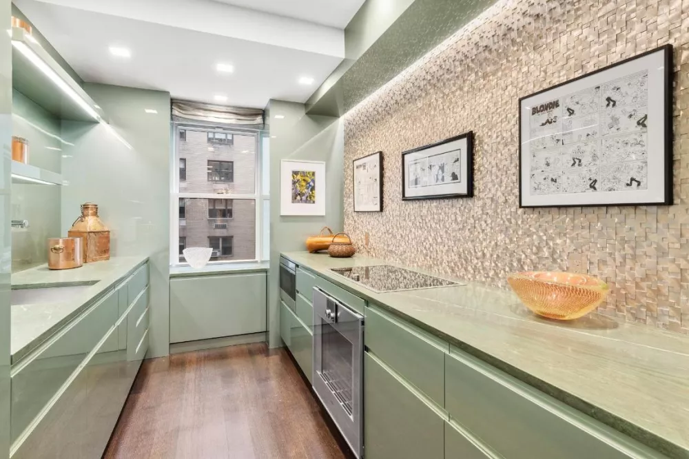 The Entry gallery flows directly into the spacious, sun-filled living room on one side and the dining room on the other. A thoughtfully designed windowed kitchen features custom lacquer cabinetry, granite countertops, detailed backsplash, and state-of-the-art stainless-steel appliances.