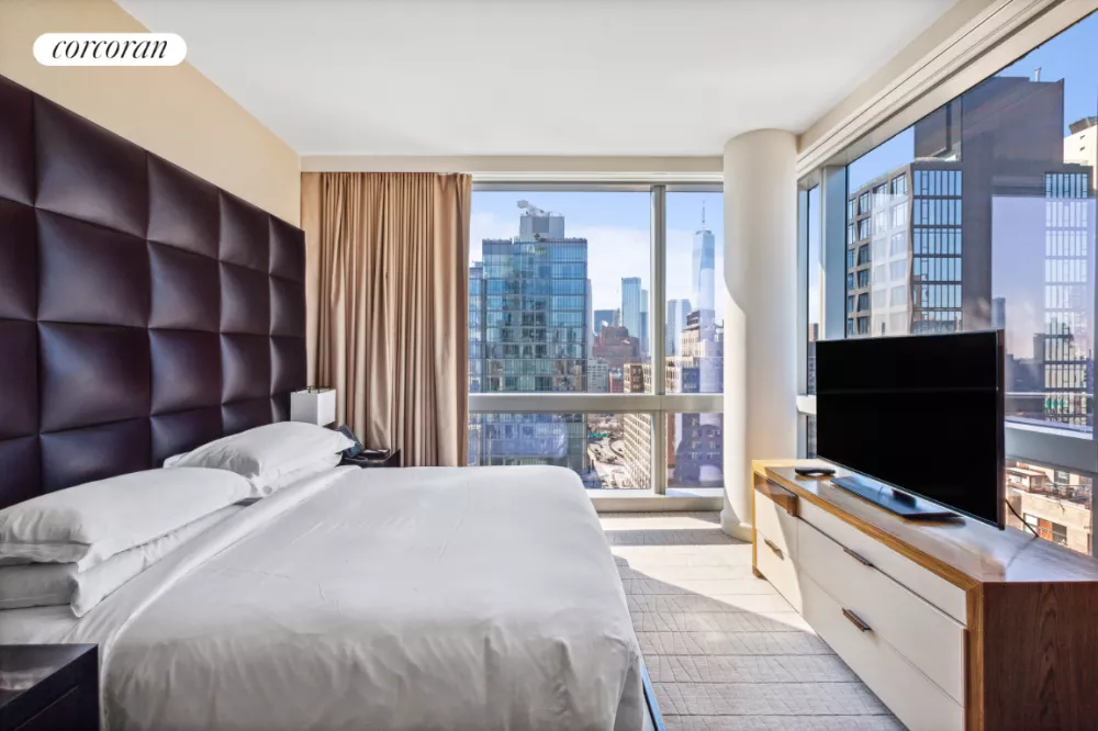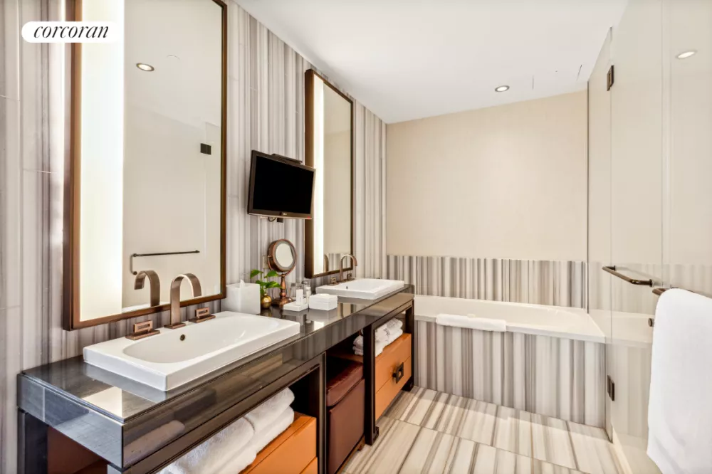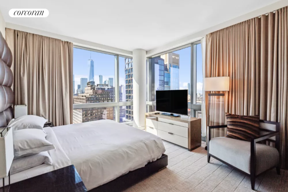 Residence 2205 at the luxurious Dominick Hotel is a fully furnished one-bedroom corner suite with separate living space, featuring floor-to-ceiling windows that offer sweeping views of Downtown Manhattan. Furnished by Fendi Casa and designed by the legendary Rockwell Group, this suite features a king-size bed, wet bar, state-of-the-art automation technology throughout, and high-end finishes including custom cabinetry with Macassar ebony doors. The luxurious bathroom includes a beautiful deep soaking tub, glass walk-in shower, and double vanity. An owner's locked closet allows for the private storage of personal items while the suite is rented to guests of the hotel.