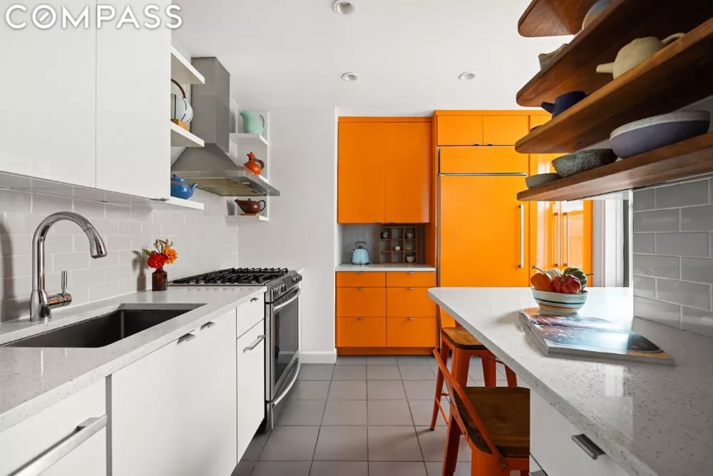 The galley, eat-in chef's dream kitchen is a true showstopper. Renovated with meticulous detail, it boasts thermoform cabinetry, quartz countertops, and high-end appliances, including a built-in Sub Zero fridge and a Bosch dishwasher. The windowed kitchen's vibrant design is perfect for cooking and entertaining, offering a delightful splash of color and light.