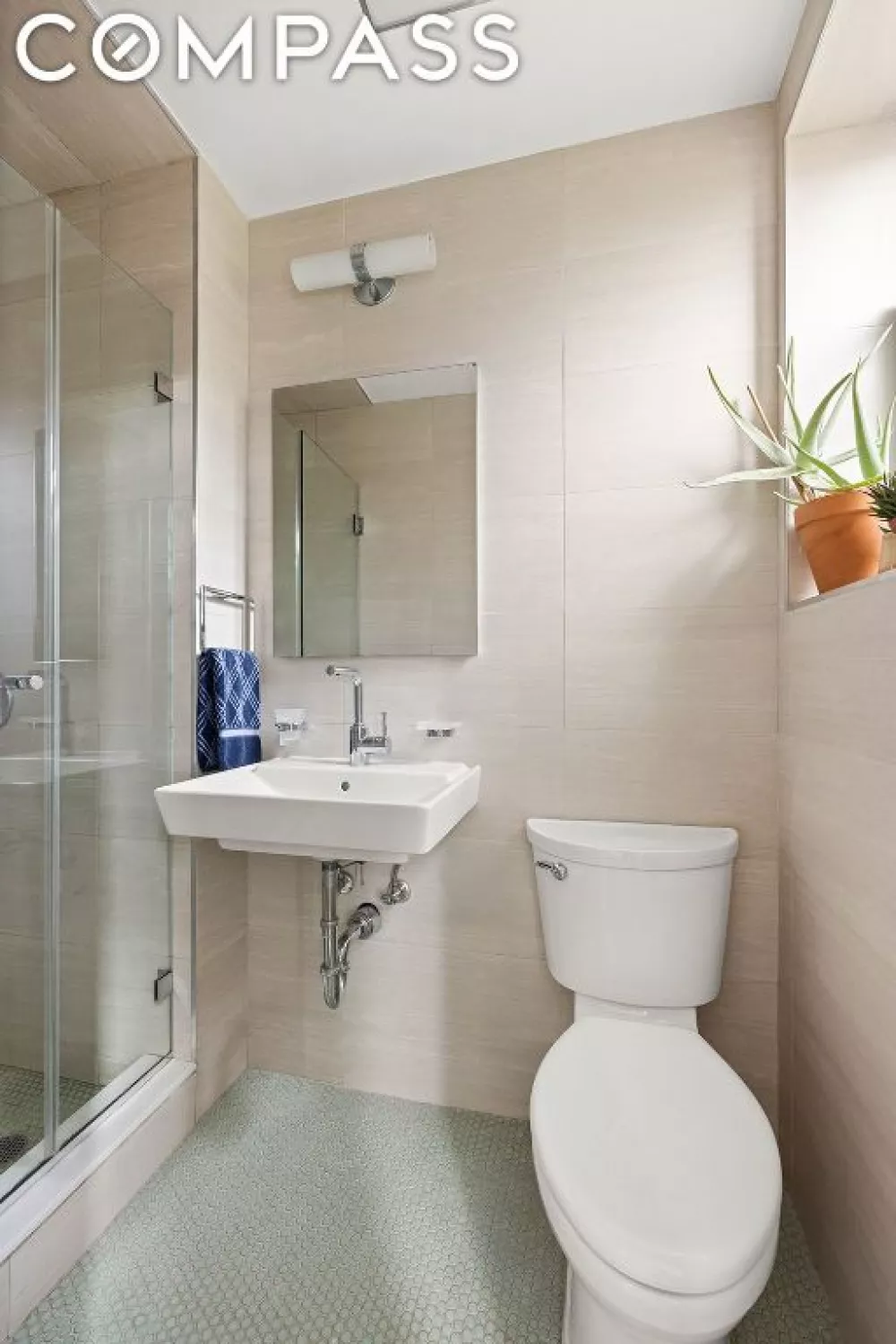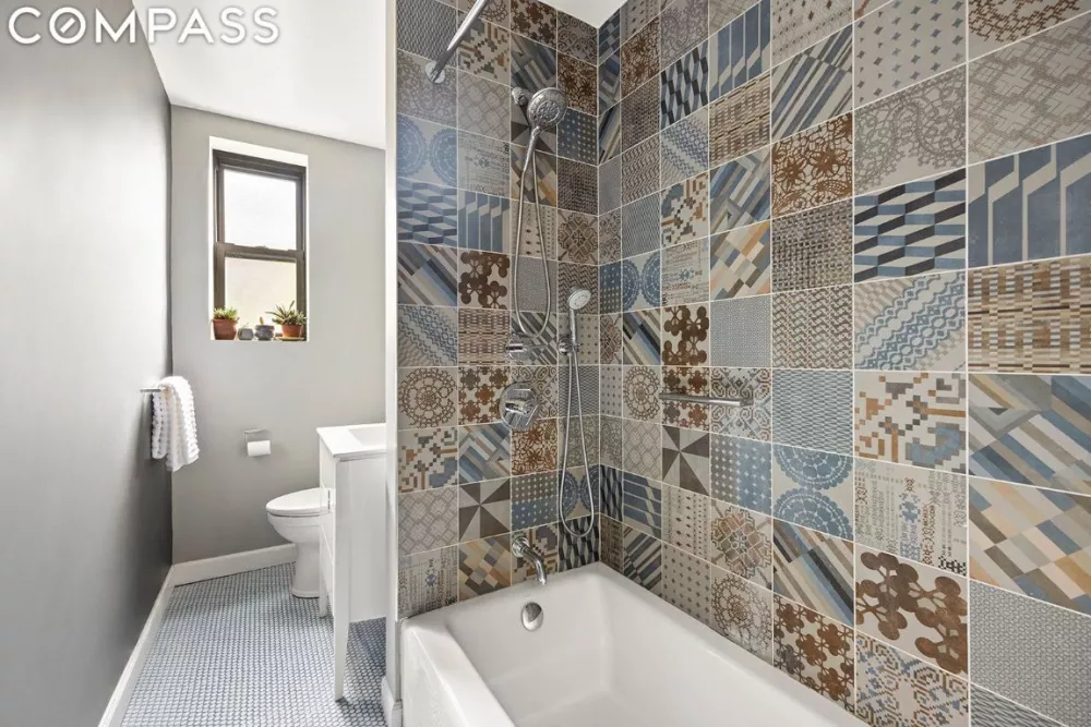 Off the main hallway, find a series of closets leading to a fully-renovated bathroom. This windowed bathroom stands out with its sleek chalkboard walls, ceramic tiles designed by Patricia Urquiola, and deep pristine bathtub. Complemented by a modern vanity and medicine chest.
