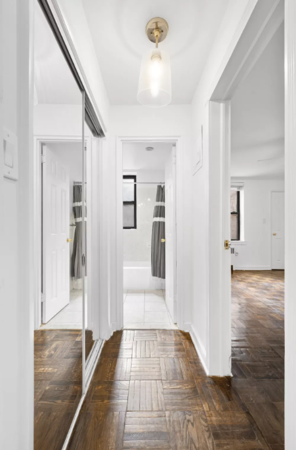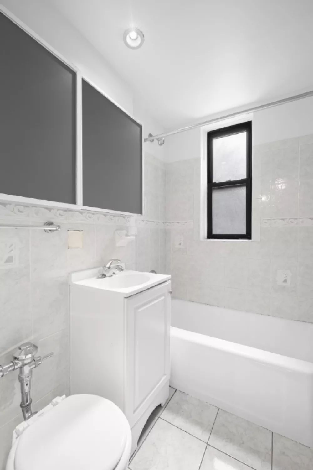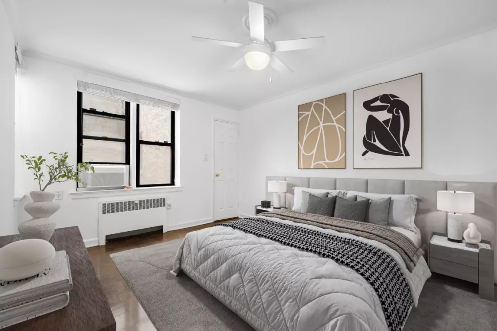 Retreat to the generous master bedroom, featuring oversized windows and abundant closet space, including a walk-in closet and a large sliding-door closet. Additional storage is also available in the hallway. The bathroom is bright and airy, showcasing a windowed shower along with all-white tiles and countertops. This apartment is impeccably maintained and move-in ready.