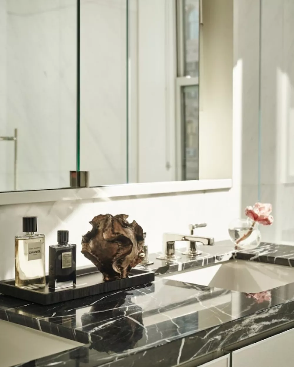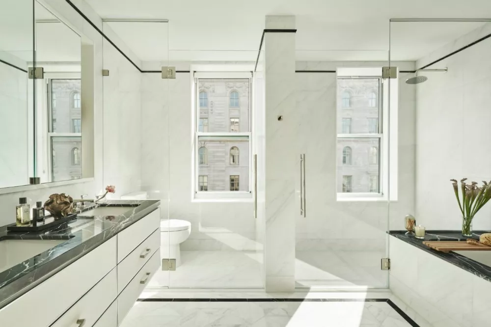 Primary baths feature honed Pacific White Marble, custom white lacquer vanities and Calacatta Black Marble countertops, glass-enclosed frameless walk-in showers and heated floors. Corduroy Deco glazed ceramic wall tiles and Calacatta Gold Marble mosaic floors are found in the secondary baths while powder rooms feature Breccia Capraia Marble slab accent walls and custom light bronze vanities.