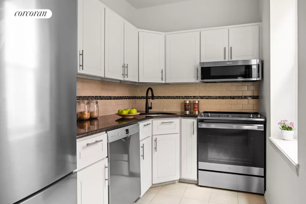The windowed kitchen boasts ample storage and workspace, along with sleek granite countertops and stainless steel appliances, seamlessly flowing into the living and dining area. The living room is bright and airy, overlooking the shared courtyard, and there's plenty of space for a separate dining area.