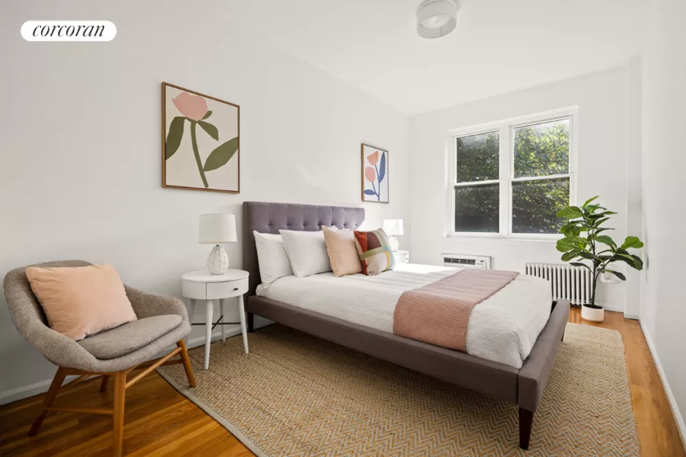 Adjacent to the living area, you'll find two sizable, south-facing bedrooms, both with large closets and plenty of room to accommodate all your needs. The renovated, windowed bathroom is outfitted with modern finishes and fixtures.