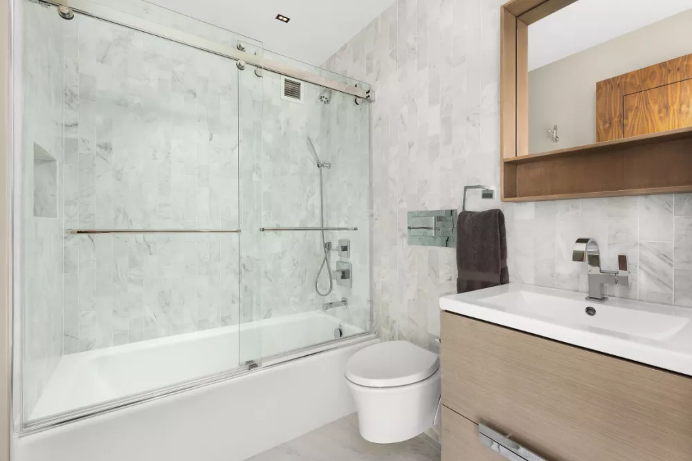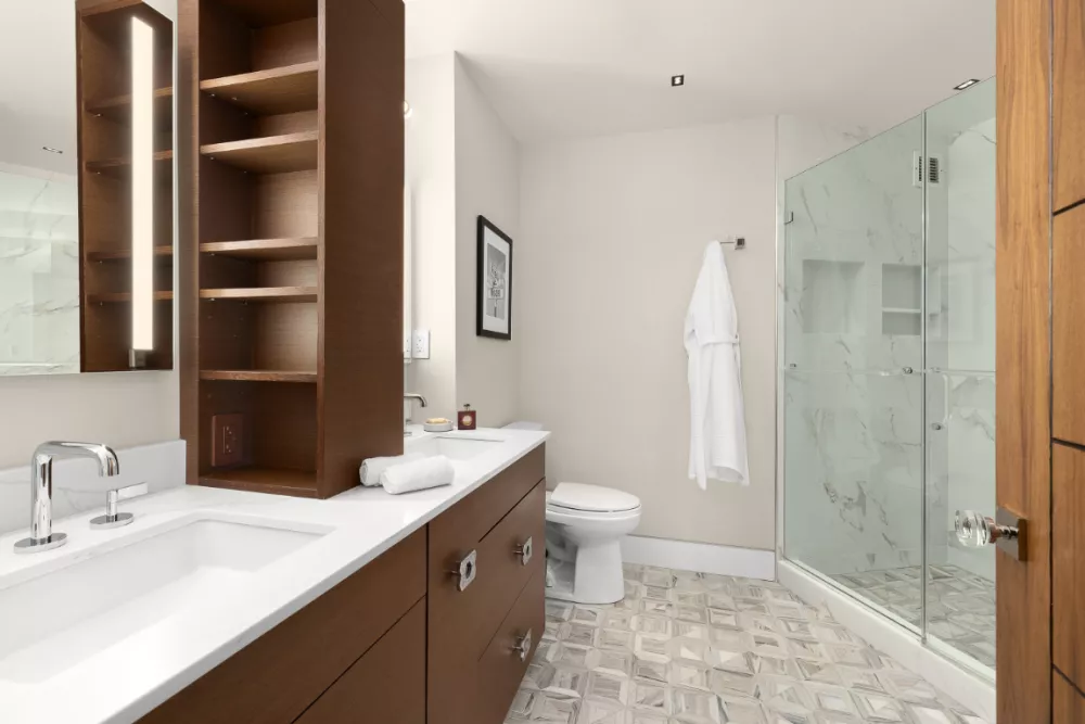 The ample primary suite hosts a king-sized bed and has three sets of custom millwork showcasing fully built-out closets and wired bedside lighting. There is a fourth additional walk-in closet just to the right of the primary bath. The primary bath features both a shower and a soaking tub, as well as radiant heated flooring, double vanities, and custom cabinetry for maximum shelf space and storage. Both the primary and secondary bedrooms, each with an ensuite bathroom, face west, while the south-facing third bedroom doubles as a den or extension of the living room with a custom sliding door that disappears, affording you maximum space for entertaining. A full third bathroom serves as the guest bath and lies just inside the hallway leading from the foyer.