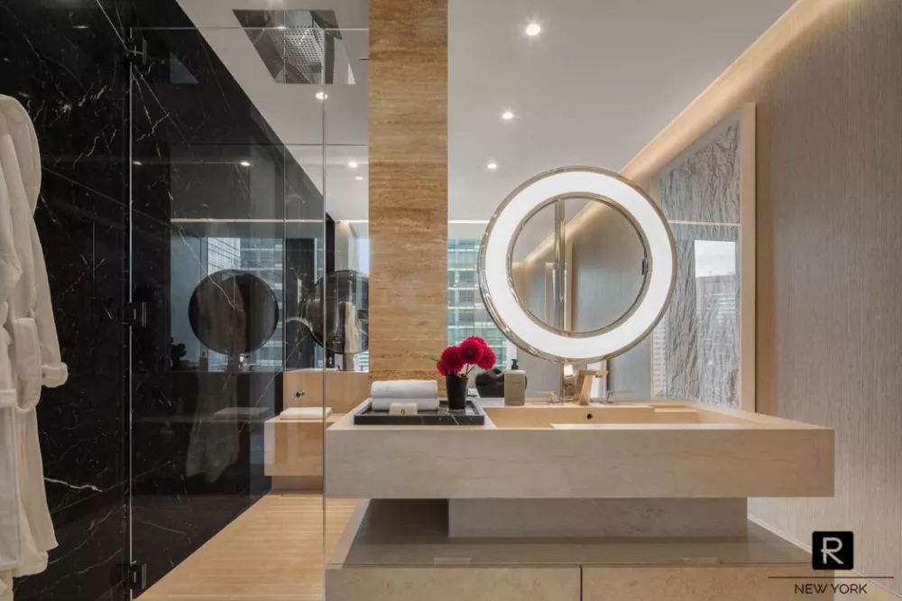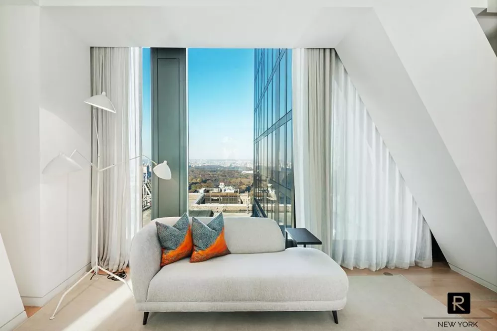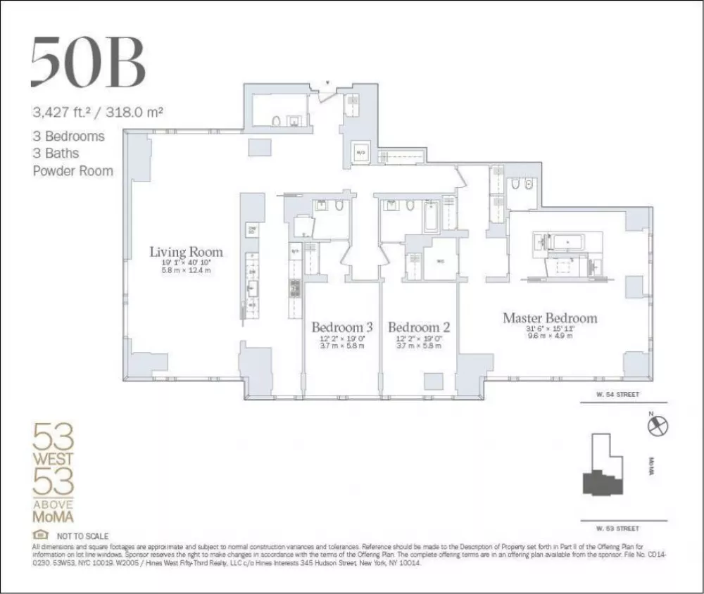 Enjoy panoramic Central Park, Hudson River, and skyline views through floor-to-ceiling windows in this half-floor residence located in the new Jean Nouvel-designed tower above The Museum of Modern Art. Nouvel’s innovative exposed structural system, known as the diagrid, is expressed like a graceful, abstract piece of sculpture creating a one-of-a-kind residence unlike any other in the world. Within this 3,427 SF (318 SM) three bedroom home, one finds a gracious entry foyer, massively scaled living room, a palatial master suite and two generous secondary bedrooms with ensuite bathrooms. With interiors by Thierry Despont, Residence 50B also boasts an eat-in, windowed kitchen with custom cabinetry by Molteni, statuary marble countertops and backlit backsplash, and complete suite of appliances by Miele and Sub-Zero. The corner master bedroom suite includes an extremely spacious master bath that features Verona limestone slab floors and baseboard, Noir St. Laurent marble and Peruvian golden travertine feature walls. High above The Museum of Modern Art, a short walk to Fifth Avenue and mere blocks from Central Park, the Jean Nouvel-designed 53 West 53 is an exclusive collection of residences with super-luxury, hotel-like services and amenities.