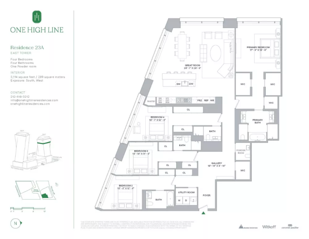 East 23A at One High Line is a 3,114 SF four-bedroom and four-and-a-half-bathroom corner residence featuring west and south exposures. This exceptional home boasts a generous great room finished with natural oak chevron floors and open kitchen with elegant Carnico Grigio marble floors, Molteni brushed Epicea wood and white lacquer cabinetry with cove lighting, and honed Calacatta Gold marble countertops and backsplash. A Calacatta Gold marble island with a brass patina frame is complemented by a raised St. Laurent marble. Fully integrated appliances include a Gaggenau refrigerator, convection oven, speed oven, and Miele ventilation hood, dishwasher, and undercounter wine refrigerator.