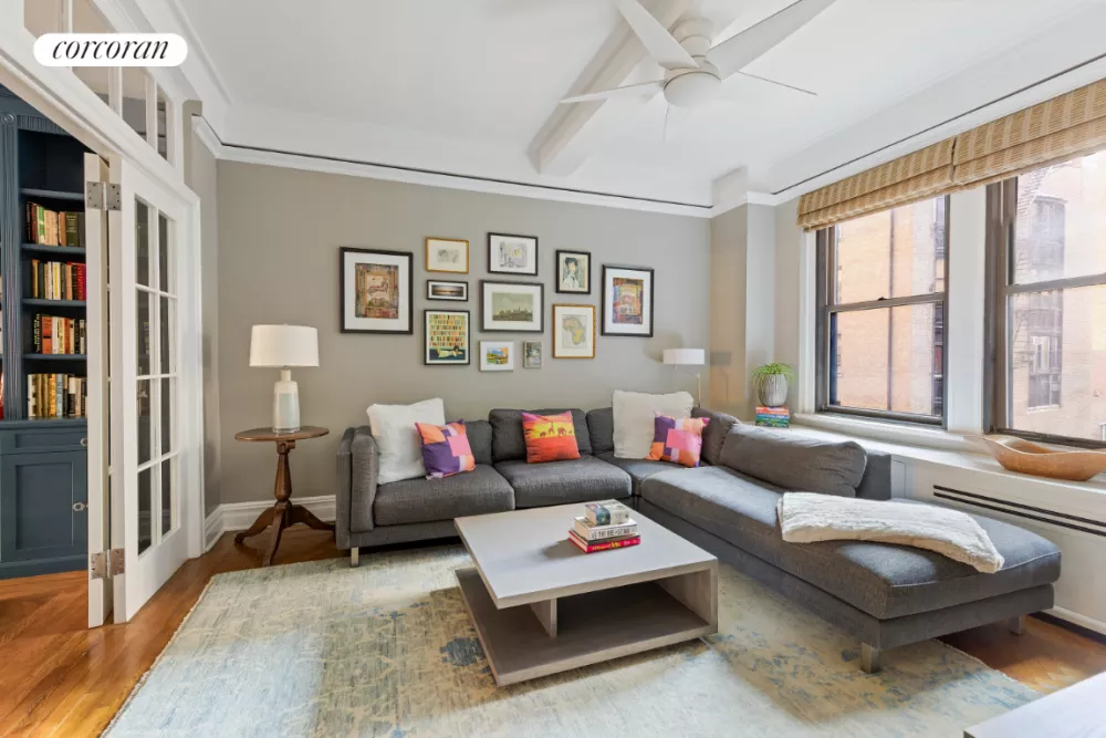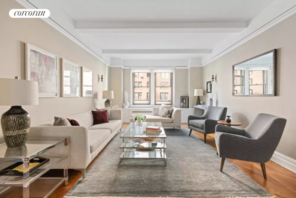 Exceptional and highly coveted pre-war Classic 6 on the Upper West Side. This sunlit home features high beamed ceilings and elegant herringbone wood floors. 13 windows with east and west exposures with natural light throughout the day. The generously proportioned living room offers charming views of... See more