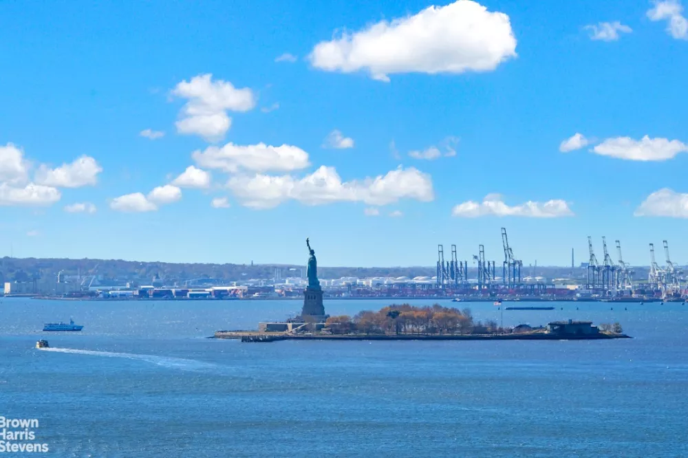 Sweeping views from every window! Residence 25-H is a beautiful two bedroom, two bathroom corner unit located on the coveted top southwest corner of Liberty Terrace Condominium. The incredible location of this tranquil oasis boasts unobstructed, panoramic  vistas of sailboats on the Hudson River with the Statue of Liberty, Ellis Island and Hudson County as part of the magnificent landscape. This lovely home offers many desirable features, including high ceilings, a split-plan layout, beautiful architectural  details, custom closets and hardwood floors. The primary bedroom boasts an en suite bath with tumbled marble stone and spa tub, as well as a private balcony. The eat in kitchen has granite countertops, Fisher& Paykel refrigerator, Miele dishwasher, GE microwave,  Whirlpool range and a lovely south-facing window in the eating area drenched in sunlight. The spacious dining room affords south and west bird's eye views, where one sees the subtle majestic bends of the river in all their glory.