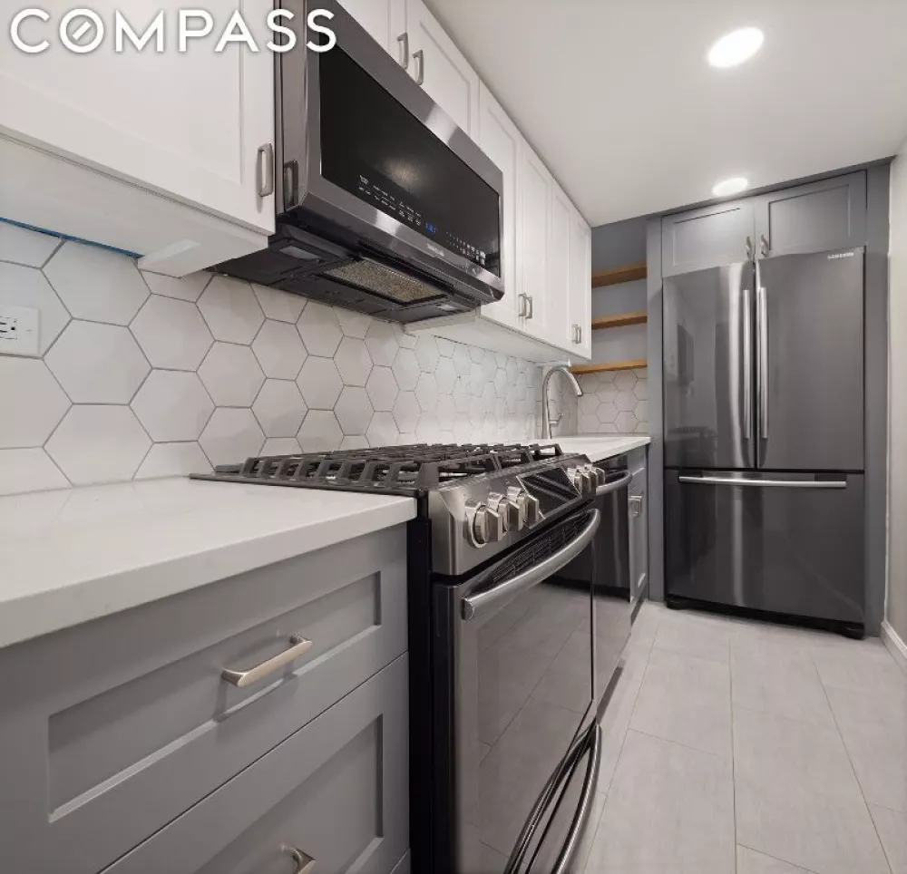 The modern kitchen features stainless steel appliances, a double-door refrigerator, a dishwasher, a gas stove, and generous countertop space for all your culinary needs.