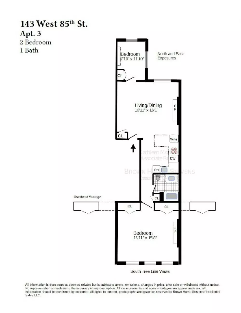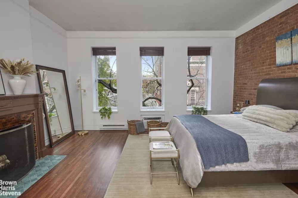 brilliant sunlight throughout the day. There are two very large custom outfitted closets both with very sizable overhead storage closets. The traditional brownstone ambiance carries through this lovely room featuring a brick wall and