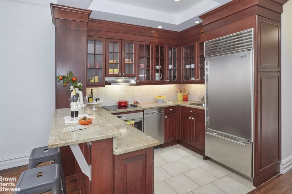 The superior kitchen configuration allows for abundant glass paned cabinets, granite counters and white tile backsplash. The generous stainless appliance package includes Sub-Zero Refrigerator, brand new Wine Refrigerator, Miele Dishwasher, Cook Top and Oven. There is a brand new garbage disposal completing this substantial kitchen.