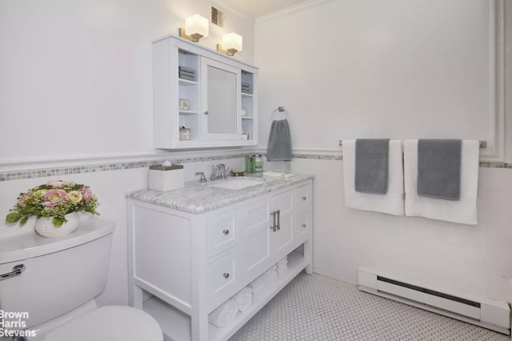 A currently enlarged and renovated bathroom has been refurbished with brand new upgrades including an expansive vanity and medicine chest allowing for abundant storage, new sconces and over-head light fixture, towel racks, hardware and new toilet.