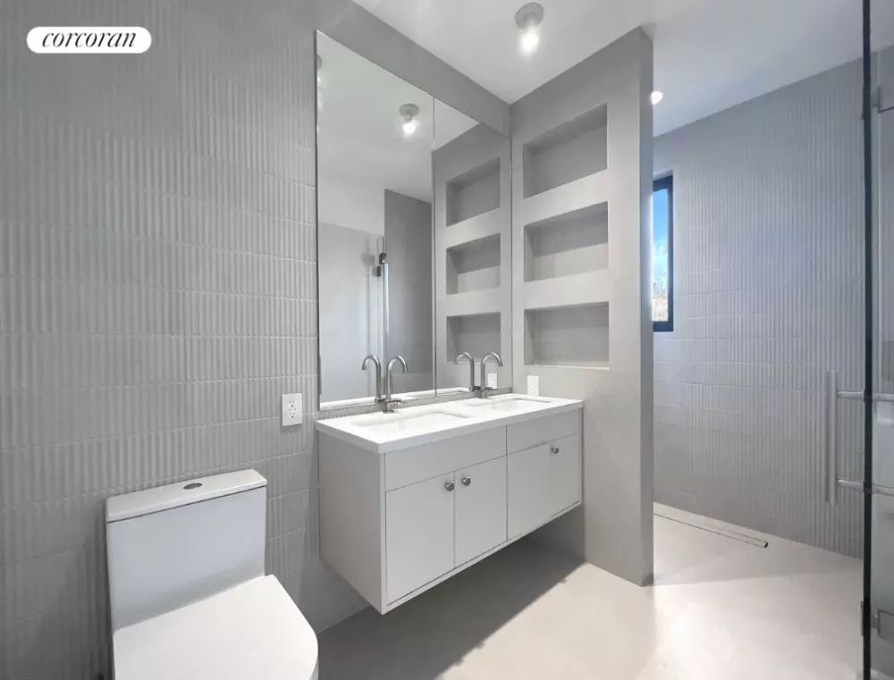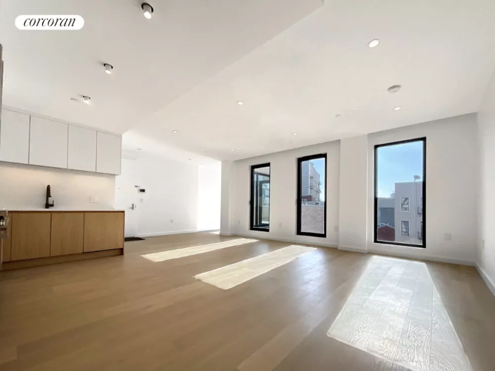 Unit 7 is an unique, sun-drenched, cornered, 1,120 sqft 2 bedroom, 2 bathroom home that features a grand terrace that looks over Greenpoint below.