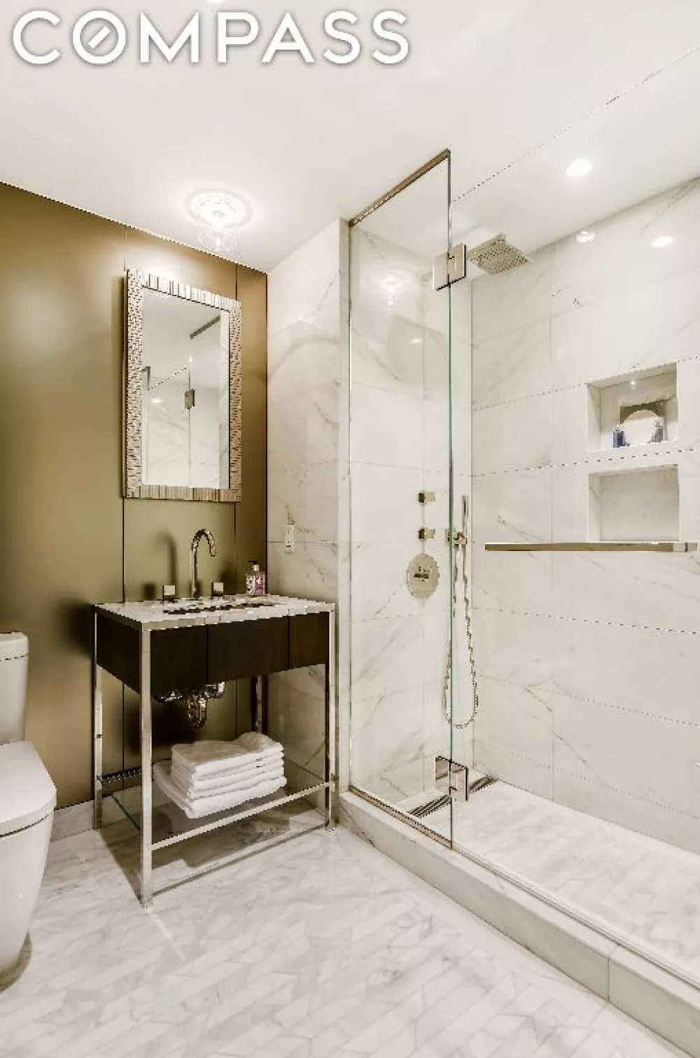 The luxurious Primary Suite is filled with light from a wall of south-facing floor to ceiling windows, and affords ample space for any wardrobe with multiple custom-fitted closets. The ensuite primary bath, accessed through custom Rimadesio white glass pocket doors, has radiant-heated Siberian White marble flooring, a custom vanity topped with Siberian Mink stone, imported Italian Fantini fittings and fixtures, a large soaking tub, and a separate walk-in shower with dual rainfall and handheld shower heads. The second bedroom is also generously proportioned, with south-facing exposures and beautiful natural light. A second full bathroom and in-unit Miele washer and dryer complete this well-appointed home.