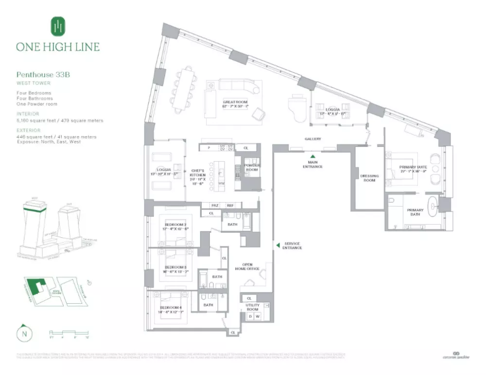 Penthouse W33B at One High Line is a 5,160 SF half-floor four-bedroom and five-and-a-half-bathroom residence curated by Gabellini Sheppard Associates. This remarkable home features northern, eastern, and western exposure overlooking the Hudson River and Manhattan skyline views and beyond. This half-floor penthouse home boasts a generous corner great room flanked by two Loggias totaling 446 SF - a north-facing Loggia with far-reaching views of the iconic Midtown horizon and another with serene vistas of the Hudson River. The custom chef's kitchen, designed by Bulthaup and complete with White Princess Quartzite countertops and backsplash, a robust Gaggenau appliance package and stainless-steel fixtures by CEA Design, can be opened into the western loggia, creating an atmosphere that is perfect for entertaining.