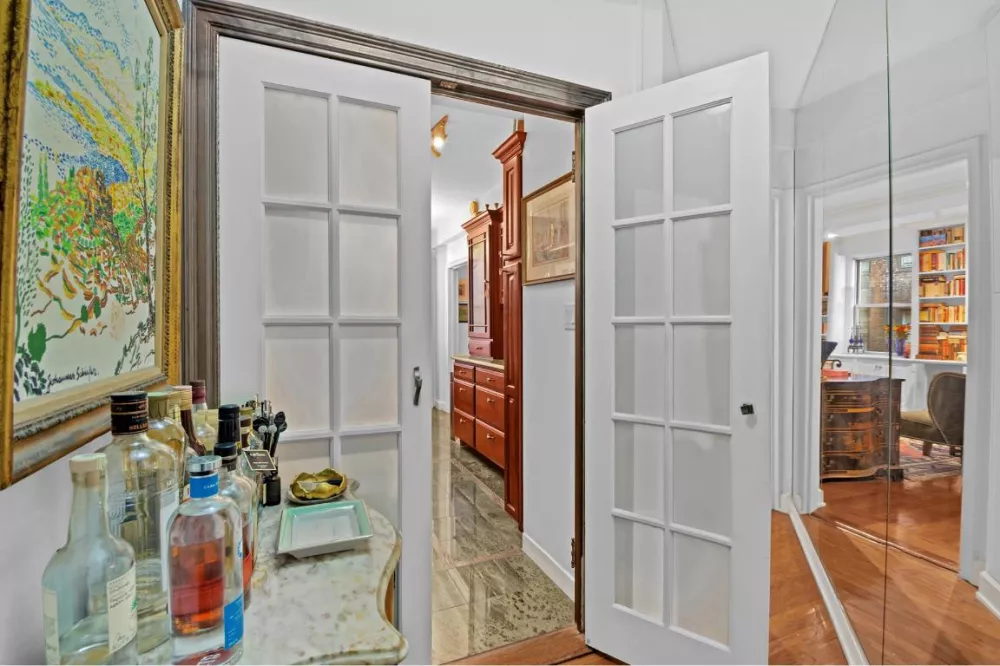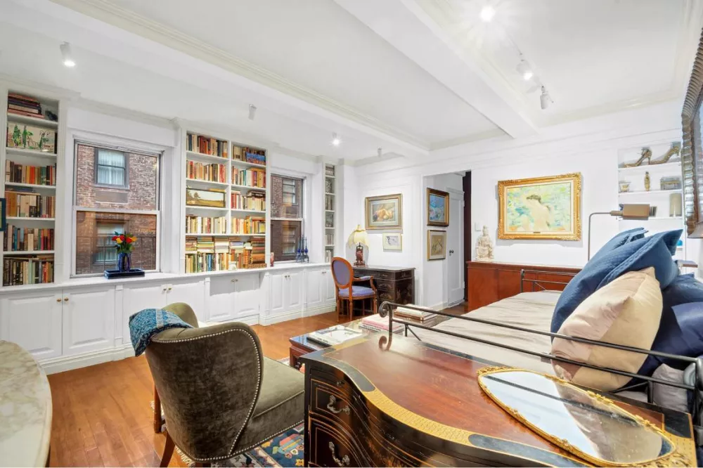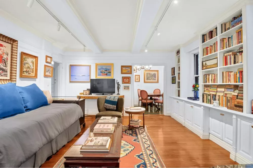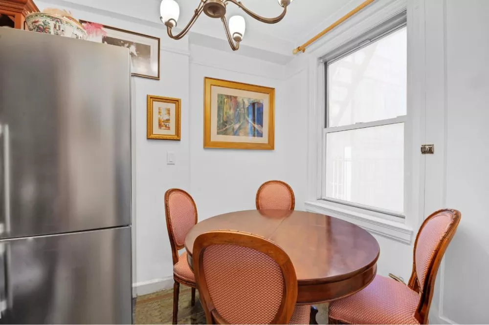 Three large windows across the living/sleeping and dining area provide natural light, with newly installed wood blinds for privacy. The home is newly painted with beautiful pre-war details including: beamed ceilings, crown molding, built in bookcases and cabinets with tons of storage space. An oversized custom-built 9'5" long three-sided walk-in closet converted from a separate sleeping alcove adds even more storage capacity.