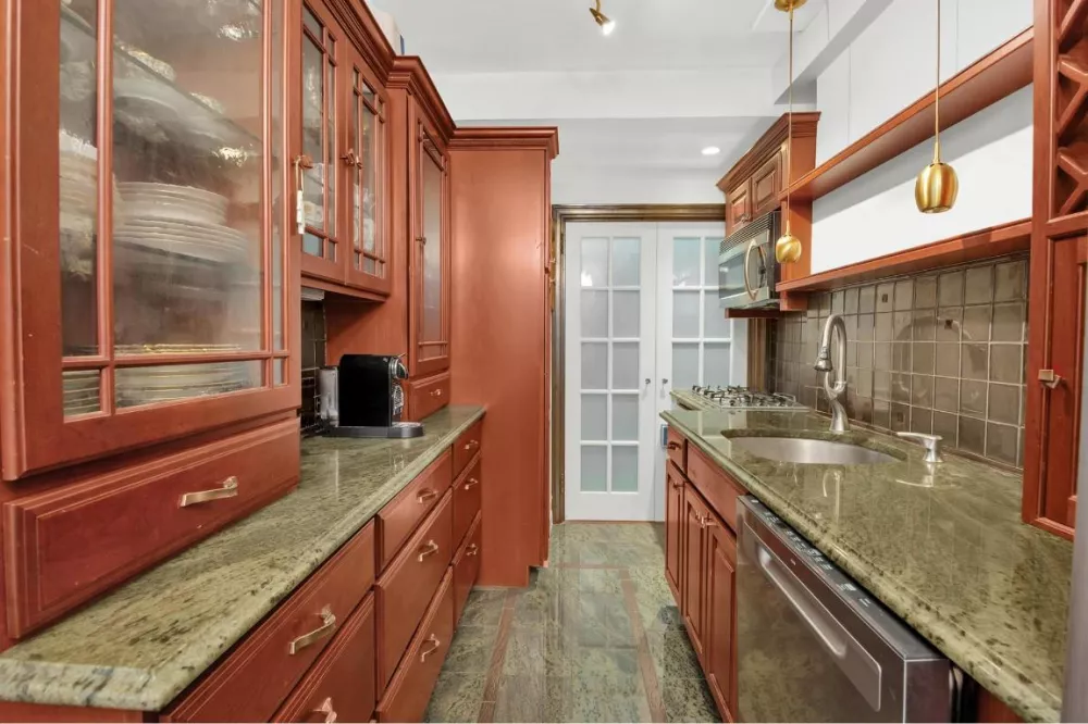 The updated kitchen features high-end wood cabinets with glass shelves and interior lighting, marble floors and countertops, and new stainless-steel appliances. The separate dining area is large enough to seat 5-6 at your table or convert to a home office space.