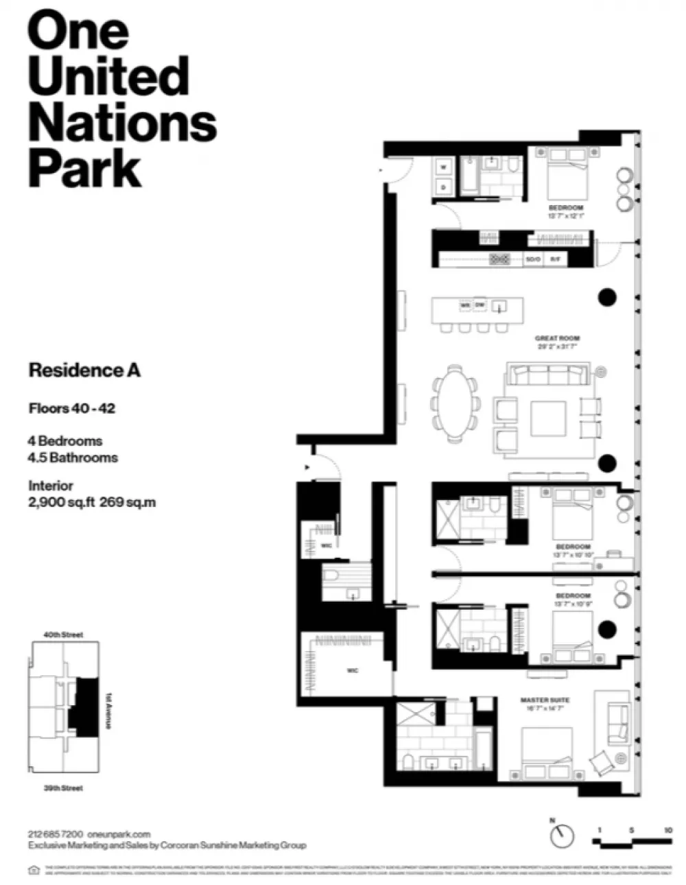Residence 40A at One United Nations Park is a 2,900sf four bedroom, four bathroom plus powder room, residence overlooking the East River. The generous layout boasts an expansive great room and open kitchen with large island. Every room is flooded with sunlight and abundant closets throughout. The primary... See more