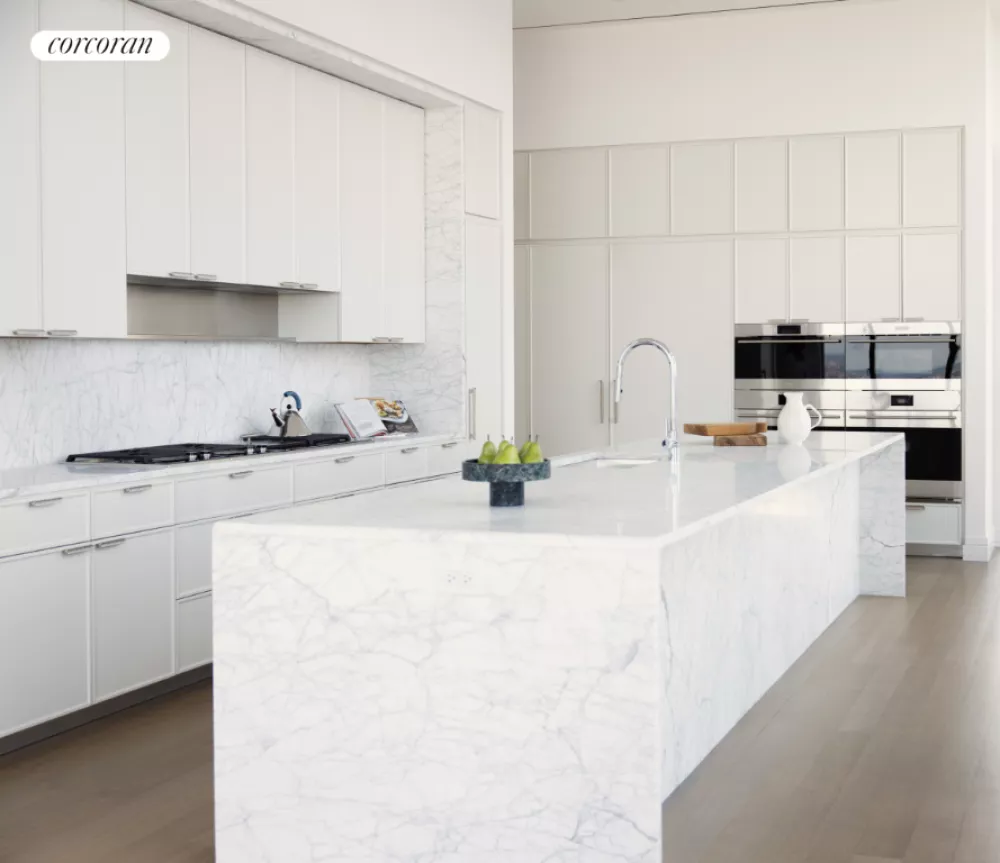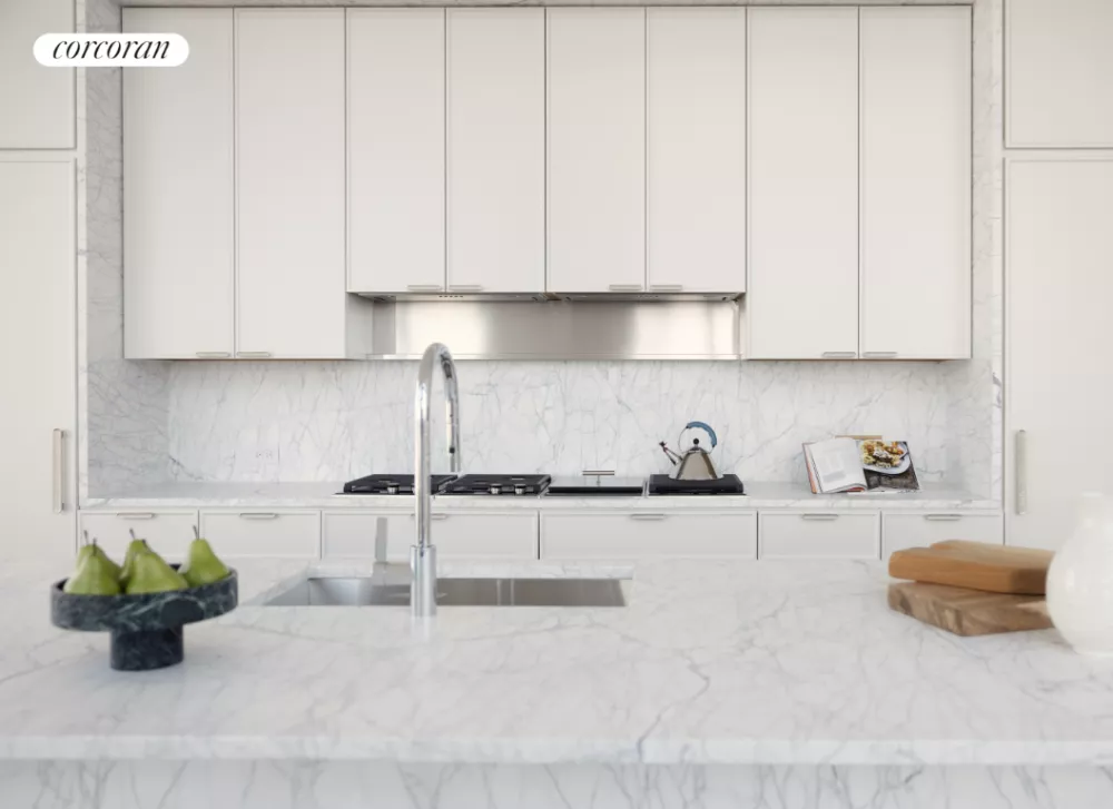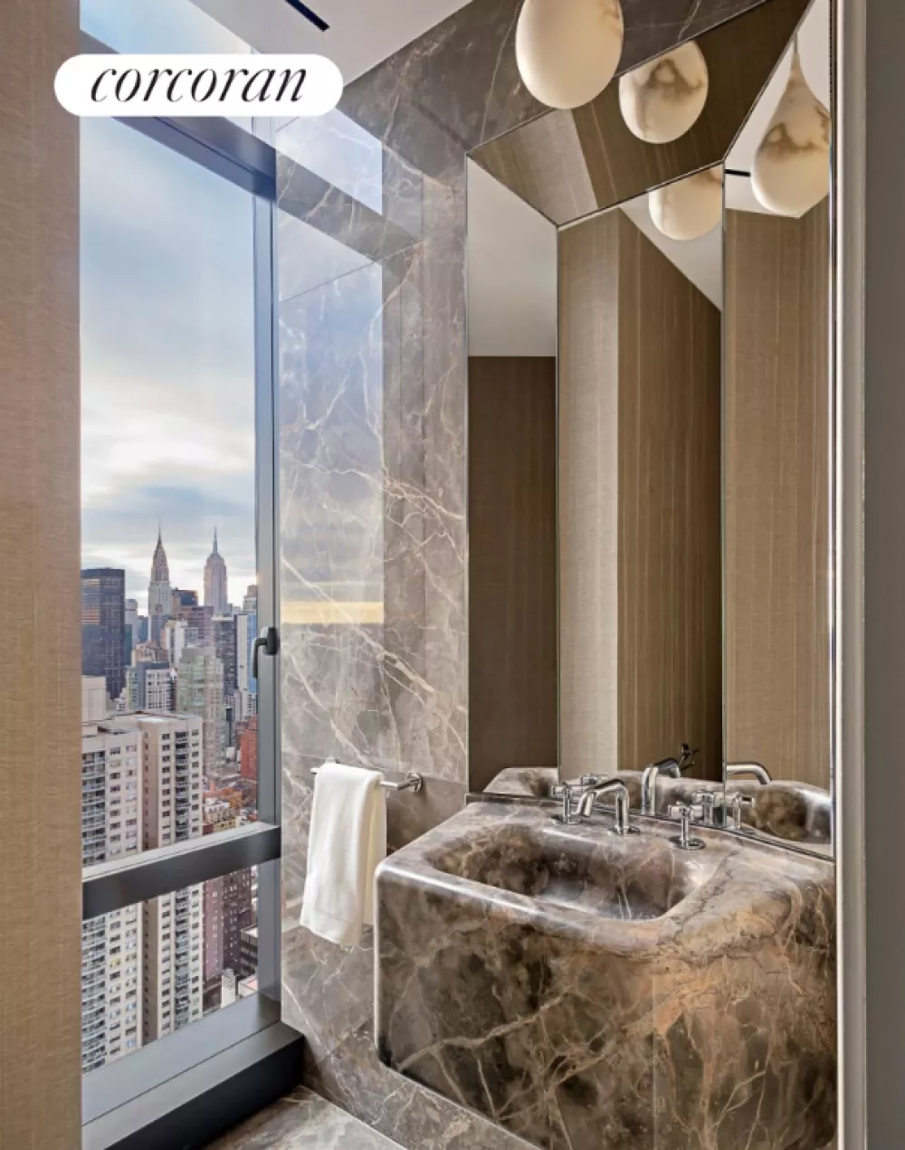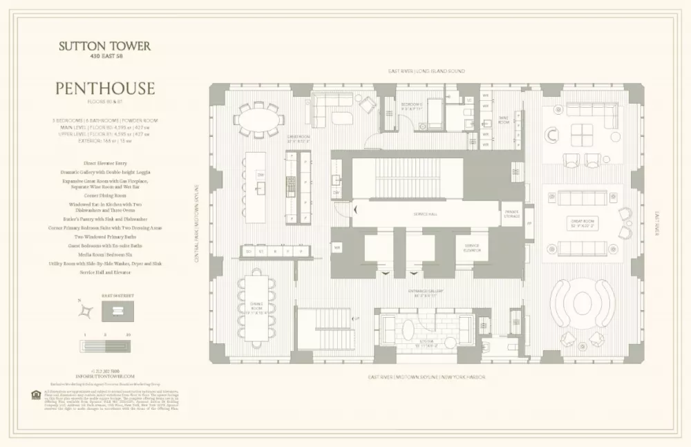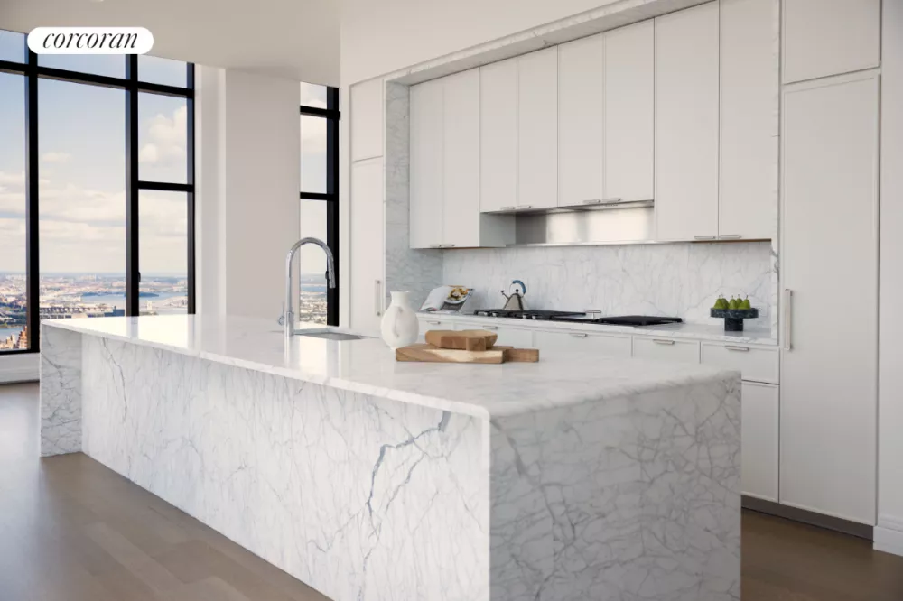 Penthouse 80 is a five-bedroom, six-and-a-half-bathroom residence featuring 9,191 square feet of interior space situated across two full floors, accented by a 166 square foot double-height loggia with southern exposure. Direct elevator entry leads into this expansive home, which offers unmatched views of The Empire State Building, Chrysler Building, New York Harbor, Central Park, George Washington Bridge, and beyond. The dramatic entry gallery leads to a 52'9" x 22'3" great room that boasts 15-foot ceilings and is appointed with a fireplace and wine room highlighted by views to the south, east and north. A northwest-facing kitchen with adjacent great room offers a Statuarietto marble island and Italian custom-crafted matte lacquer white cabinetry adorned with Sub-Zero and Wolf appliances. A formal dining room, butler's pantry, secondary bedroom and elegant powder room highlighted with Fior di Bosco marble complete the first floor.