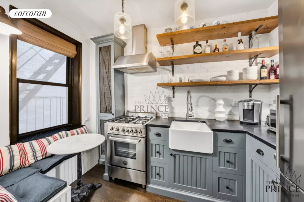 The kitchen is a chef's dream, boasting custom beadboard cabinetry, honed Nero Marquina black marble countertops, and tailor-made floating wood shelves. Top-of-the-line appliances include a Bertazzoni gas range with a stainless steel hood, a Liebherr refrigerator, and a farmhouse sink with a professional-grade faucet. Enjoy your morning coffee in the built-in banquette, which also provides additional storage.