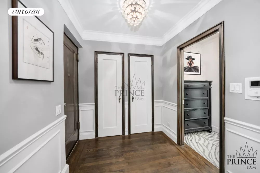 This chic, turn-key studio offers a thoughtfully designed space featuring a designated dressing area, a cozy breakfast nook, and a spa-like bathroom. Upon entering, you'll immediately notice the attention to detail throughout the expansive, loft-like studio. The foyer welcomes you with a stylish, vintage feel, complemented by elegant moldings and finishes.The living/sleeping area is open and inviting, highlighted by floor-to-ceiling custom-milled bookshelves. The apartment's sophisticated aesthetic includes raw steel door frames, artisanal door hardware, and refinished dark walnut floors.