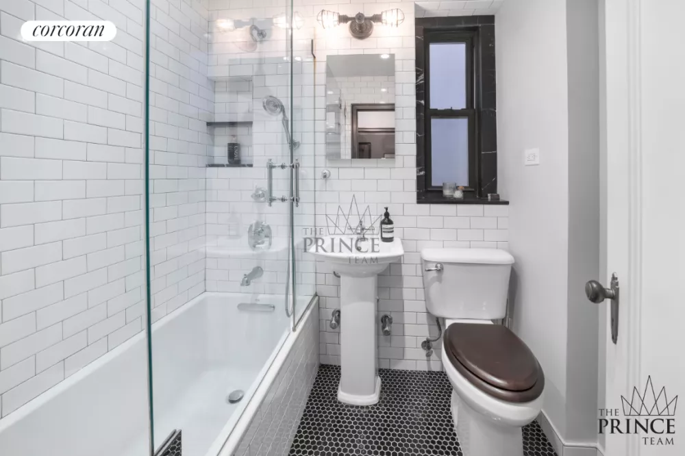 The spacious dressing alcove, framed by a massive built-in mirror, offers two large closets with plenty of room for all your belongings. End your day in the spa-like bathroom, complete with gleaming white subway tiles, a deep soaking tub, a rain shower head, and chic black hexagon floor tiles.