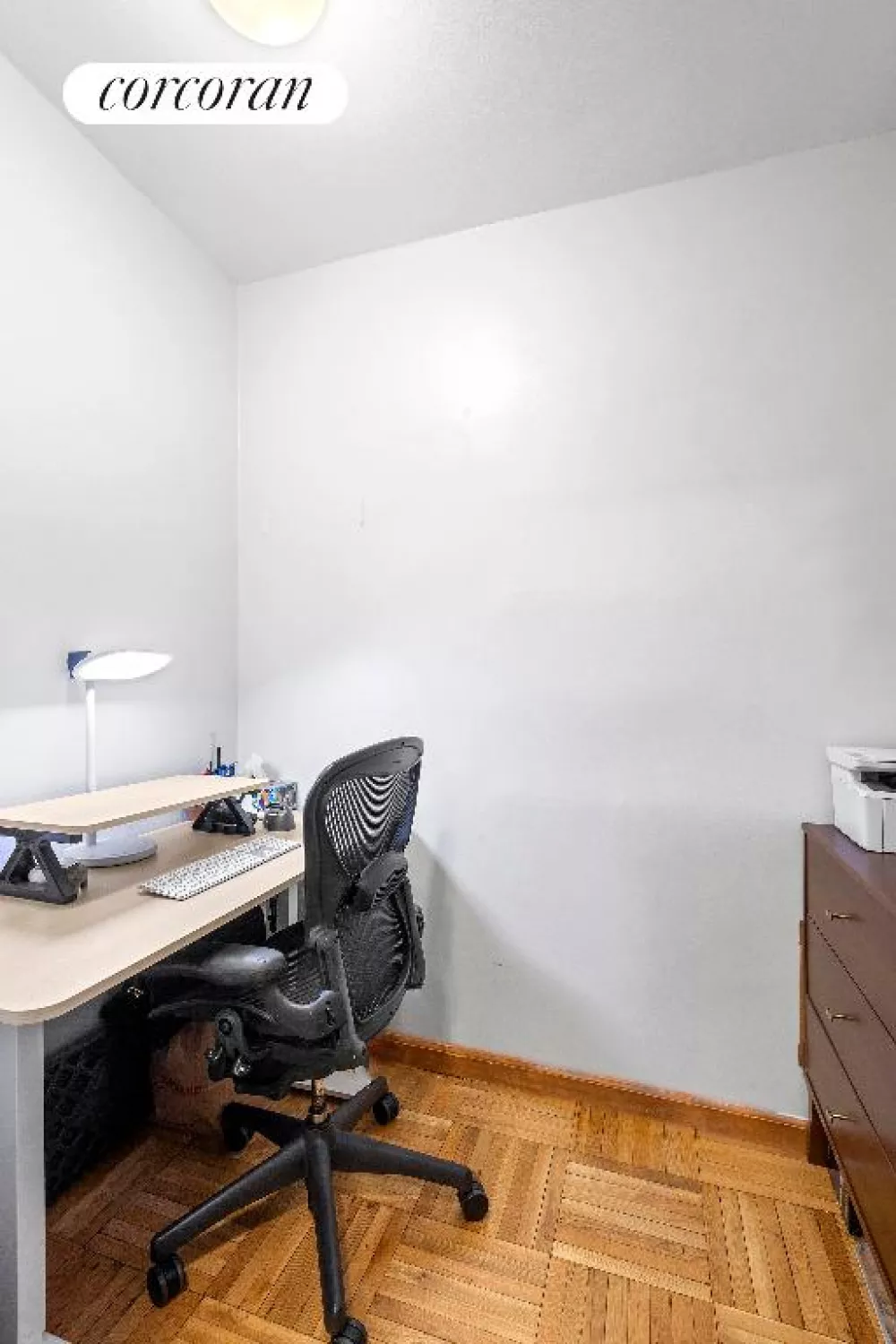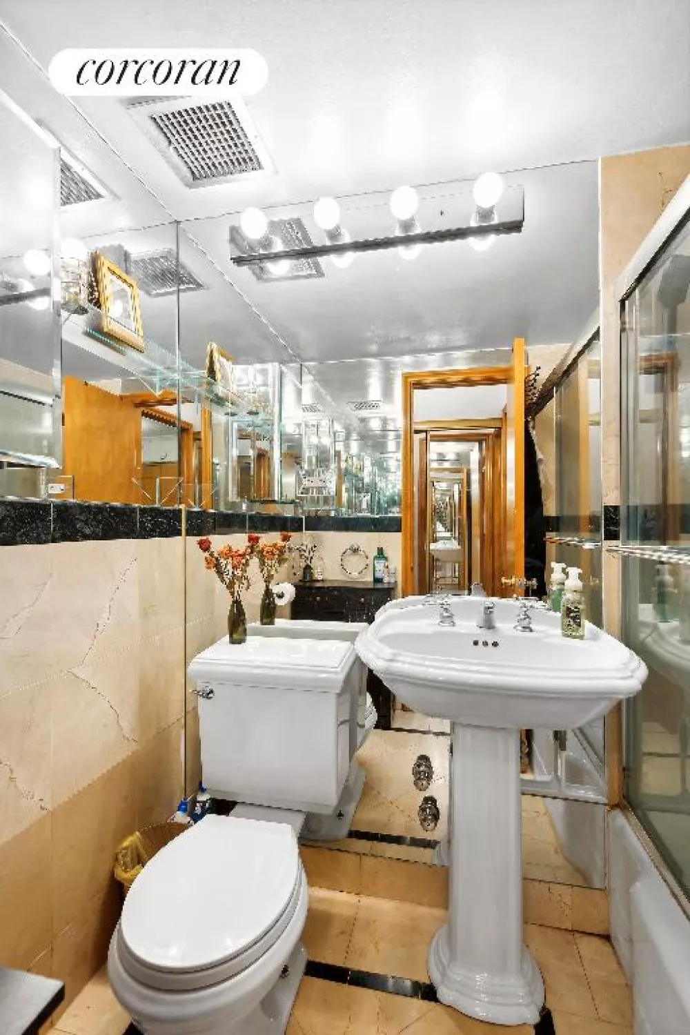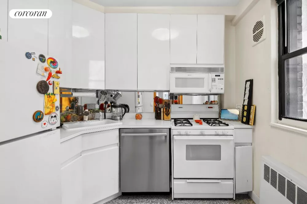 The windowed kitchen is unusually spacious for a studio and includes a dishwasher, while the luxurious marble bathroom with mirrored walls adds a touch of elegance. Custom closet shelving and built-ins, along with classic parquet flooring, complete the apartment's refined aesthetic.