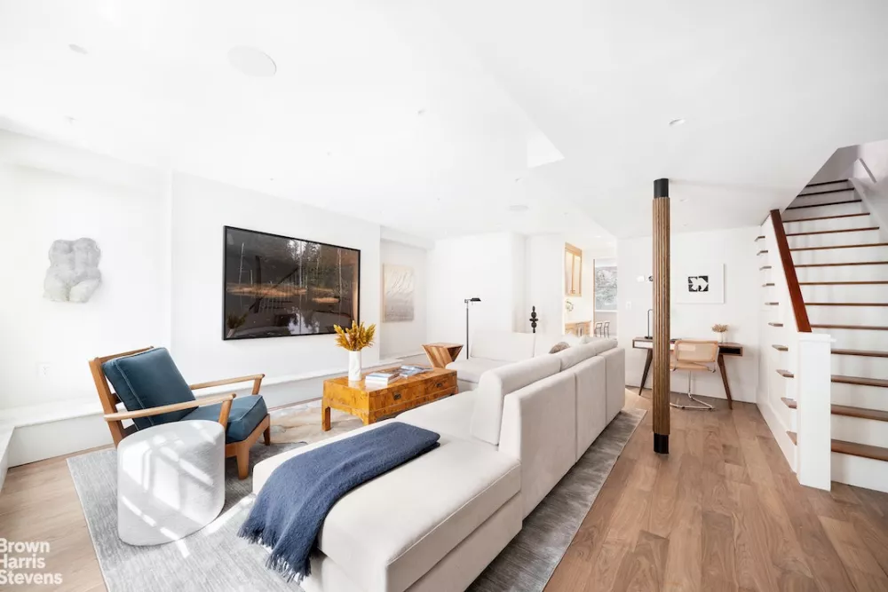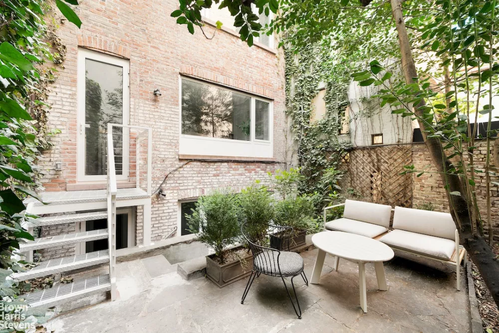 The delightful Garden Floor features a large living room, a kitchenette, and private guest bedroom that also can be used as an office with a full en-suite bathroom. Making use of the home's second entrance underneath the stoop, the Garden Floor affords flexible usage as either a recreation/living area incorporated into the upper levels, a private guest suite, or an income-producing rental apartment. The splendid kitchenette on this level is lined with honed Carrara marble countertops equipped with a dishwasher. The serene, well-planted garden receives delightful sunlight and offers ample outdoor dining, entertaining, and private relaxation space. This level also provides abundant storage space or a secret wine room underneath the stoop.