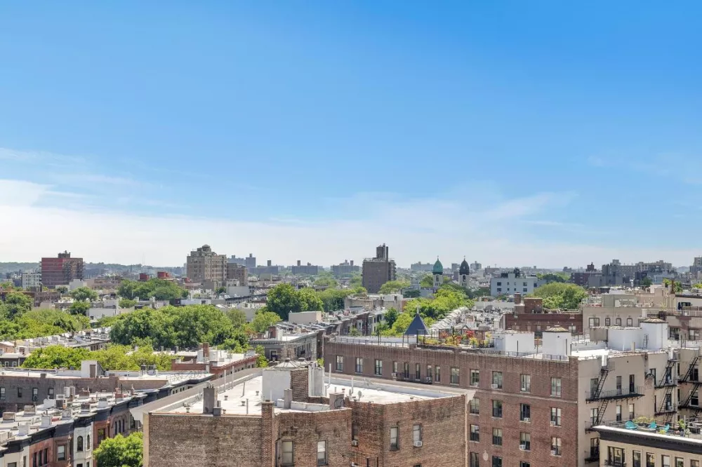 WELCOME HOME to this beautiful Penthouse top floor home offering sun splashed southern and eastern light. This two bedroom on bath home is perfectly nestled in the heart of Prospect Heights. The oversized living room is flooded with natural light is an inviting space. The kitchen with its ample custom cabinetry and counter space is perfect for bringing out your inner chef! Enjoy delicious meals and conversations in the dining area. The tranquil bedroom enjoys a lovely bay window with wide-open views. The second room is quiet and comfortable. 4 large closets, a spacious entry complete this lovely residence. Enjoy sunset cocktails on the common roof deck offering magnificent 360 degree views of Prospect Park, the Manhattan skyline and New York Harbor.