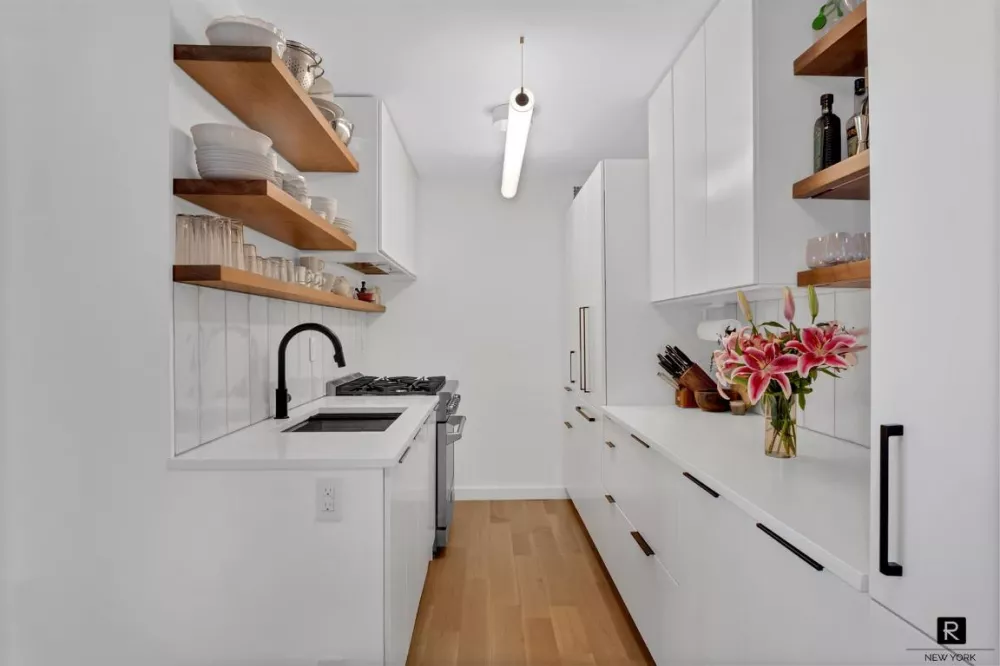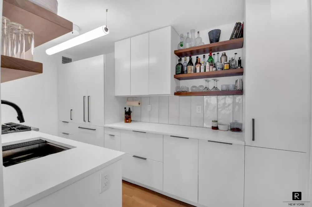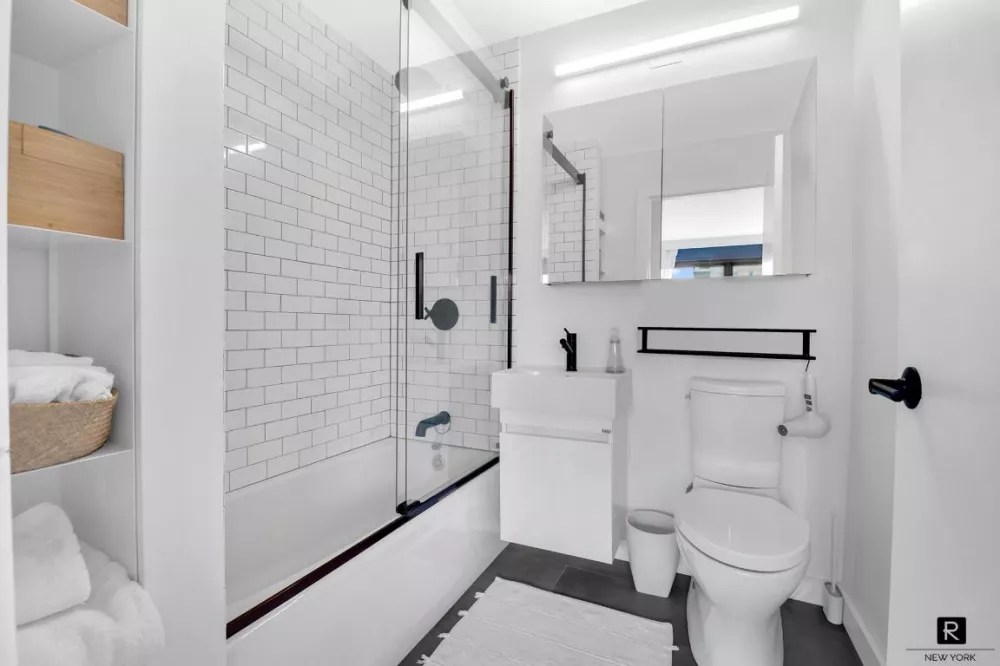 The kitchen is a culinary masterpiece, designed with floating solid walnut open shelving, a hidden Samsung countertop microwave, a 5-burner Forno gas range, an 18” Blomberg fully integrated dishwasher, and a premium Fisher & Paykel refrigerator. The bathroom exudes modern elegance with a sleek Koehler mirrored floating vanity, subway tile accents, and built-in shelves for added convenience.