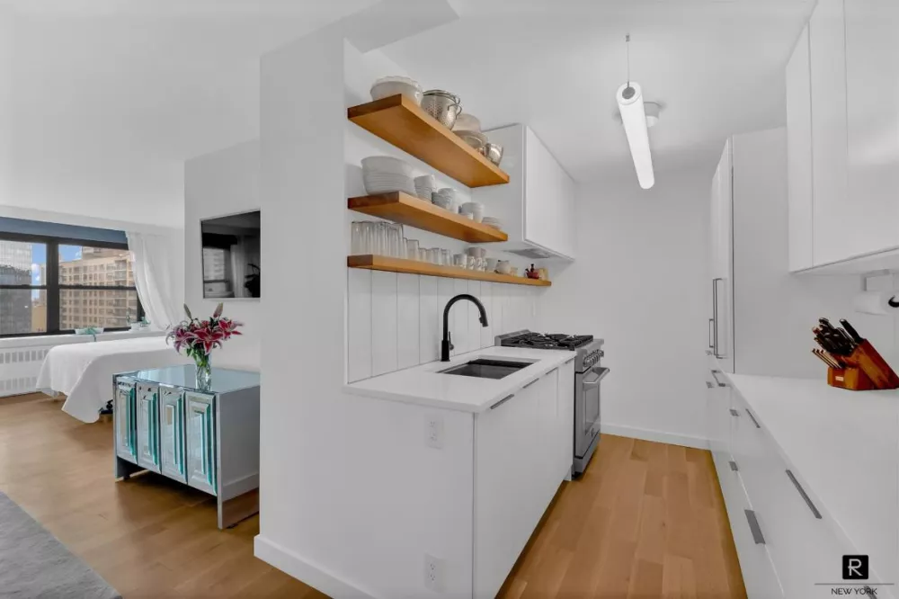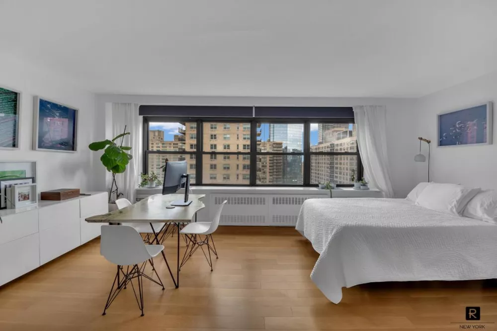 This high-floor, sun-drenched alcove studio offers expansive eastern city views, filling the space with abundant natural light throughout the day. A designer's dream, the studio has been completely renovated, featuring rift and quarter sawn white oak plank flooring that creates a warm and inviting ambiance. Ample built-in closets and custom cabinetry provide generous storage while seamlessly blending style with functionality. The integrated lighting adds a sophisticated touch, perfect for entertaining or relaxing after a long day.