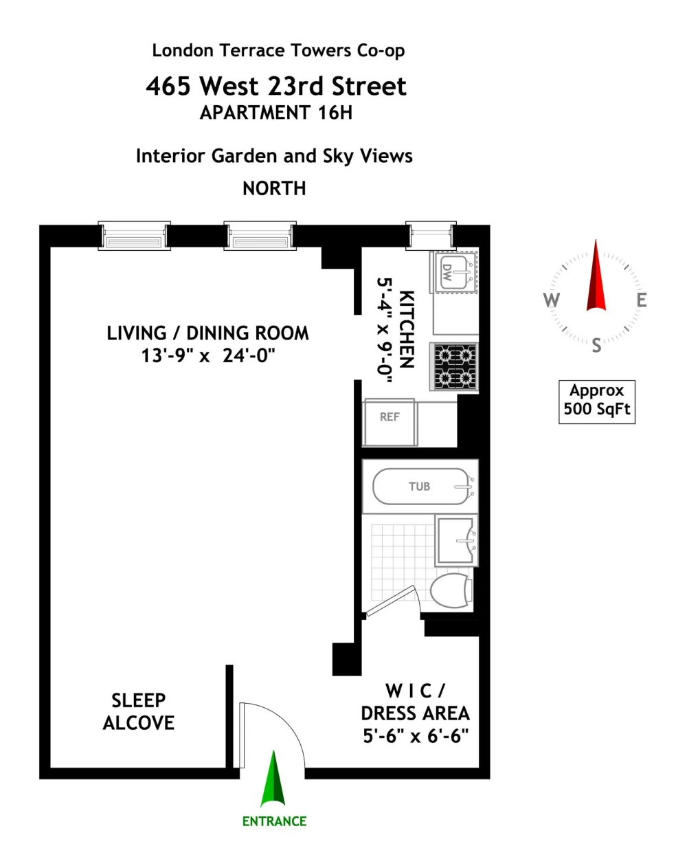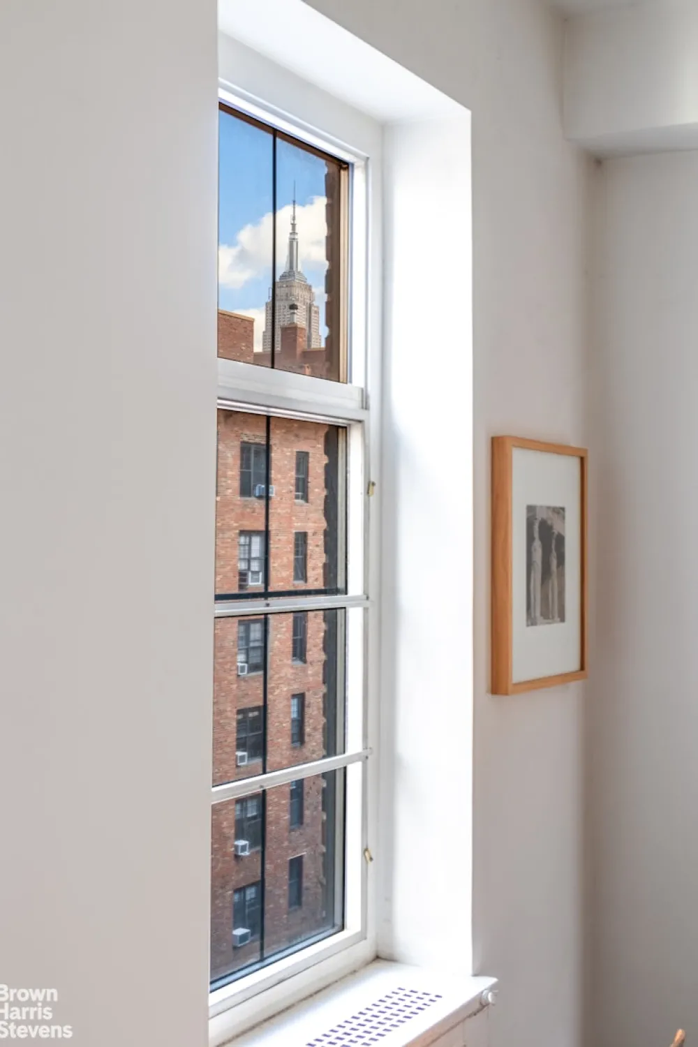 Perched high-up on the 16th floor this bright, north-facing alcove studio (convertible junior 1 bed) is waiting your creative touch. Apt 16H offers amazing natural light with peaks of the Empire State Building and Manhattan West and serene internal garden vistas. The windowed kitchen is equipped with a Viking oven with 4-burner cooktop, GE dishwasher, and GE fridge. The flexible layout allows for easy transformation, with the alcove area comfortably fitting a Queen-sized bed. It can also be customized to include a hidden closet space, giving it the feel of a junior one-bedroom. Additionally, the apartment features a separate dressing area, offering even more convenience and storage. The original bathroom adds character and charm to this space, providing a classic feel. This studio is perfect for those seeking a quiet retreat with excellent light and an unbeatable location. Schedule your viewing today!