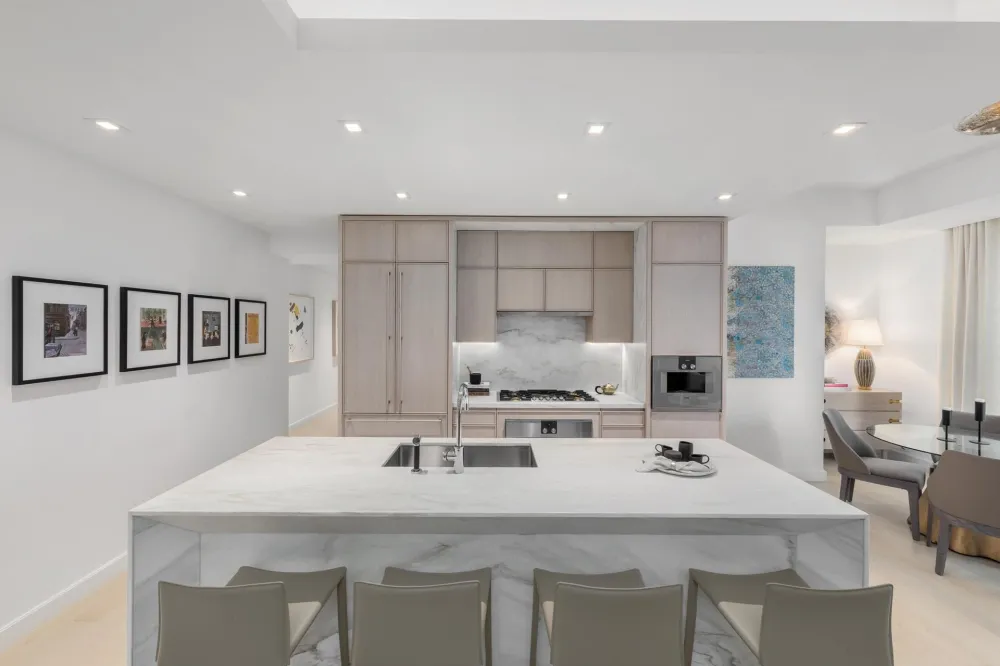 This one bedroom, one and a half bathroom residence designed by Champaulimaud offers northern exposures through floor-to-ceiling windows. White oak flooring throughout leads from the entry into an open living and dining concept, complete with a chef's kitchen offering honed Capri marble countertops, backsplash, and a waterfall island with room for seating. The kitchen has a refined aesthetic with streamlined custom white oak millwork that seamlessly integrates a full Gaggenau appliance package, including an undercounter wine refrigerator, complemented by Dornbracht fixtures.