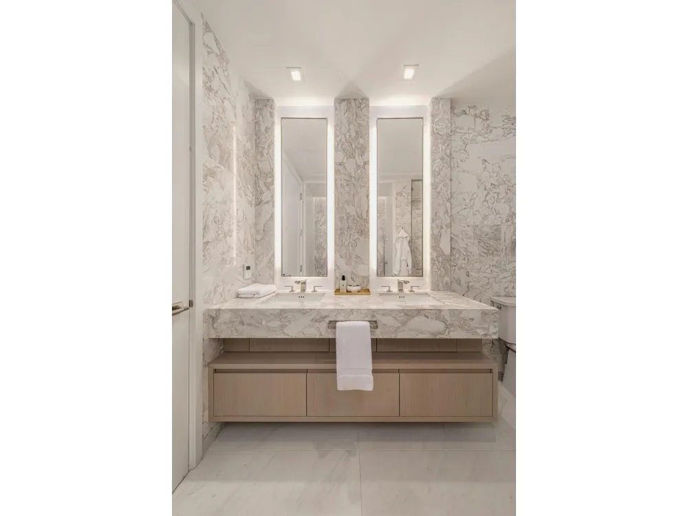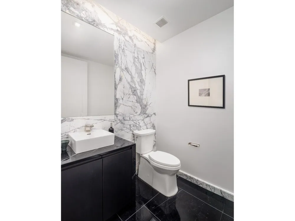 The corner master bedroom features an expansive walk-in closet and en-suite master bath. The serene master bath offers Bianco Dolomiti radiant heated flooring underfoot, an enclosed shower, and a separate Kohler tub with Marno Illusion marble details. A custom vanity with white oak, rift-cut wood veneer millwork, and Marno Illusion countertops is completed with a built-in medicine cabinet, Kallista Sink and Dornbracht Fixtures. A unique powder room features a dramatically veined Nero Maquina vanity countertop, ebony stained oak quarter cut wood veneer vanity and Nero Maquina floors. An eye-catching Cobalt Flash marble wet wall, Dornbracht fixtures and a Kohler Corbelle toilet offers a striking contrast against the dark woods and stones. A Nest Learning Thermostat and Bosch washer and dryer complete this elegant residence.