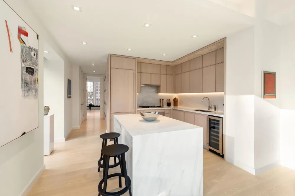 This expansive one bedroom, one and a half bathroom residence designed by Champalimaud offers northern, western, and southern exposures through floor-to-ceiling windows. White oak flooring throughout leads from the entry into an open living and dining concept, complete with a chef's kitchen offering honed Capri marble countertops, backsplash, and a waterfall island with room for seating. The kitchen has a refined aesthetic with streamlined custom white oak millwork that seamlessly integrates a full Gaggenau appliance package, including an undercounter wine refrigerator, complemented by Dornbracht fixtures.