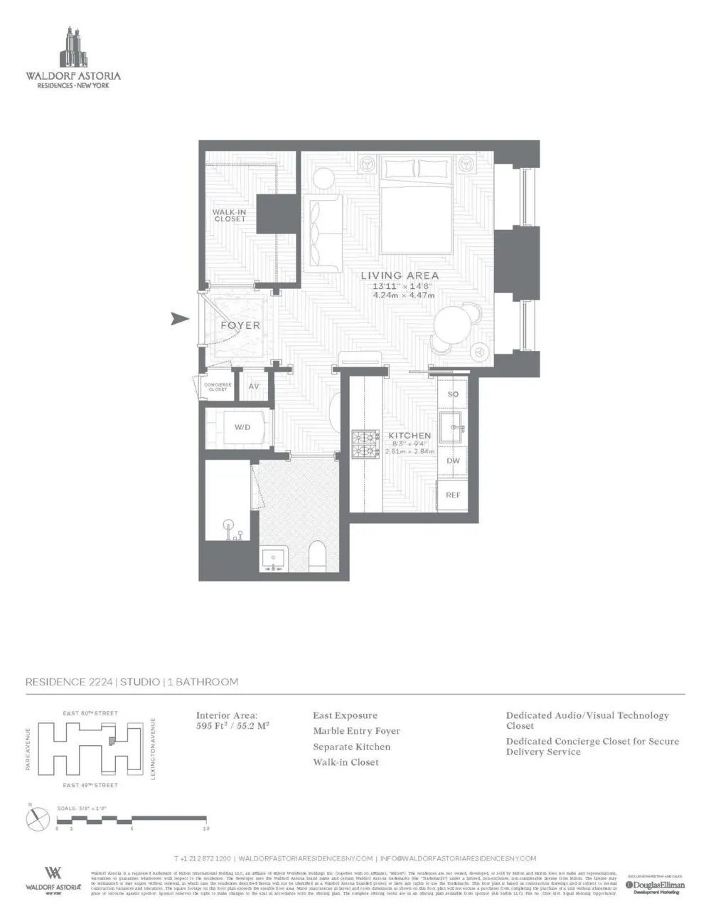 Own a piece of the legacy at Waldorf Astoria Residences New York. Residence 2224 is a one-of-a-kind, gracious studio with eastern exposure, overlooking a landscaped terrace. The 595 SF home offers a large walk-in-closet which is conveniently situated near the foyer, bathroom and living area.