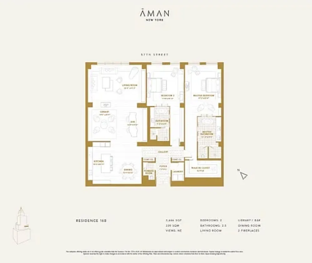 The copper-clad pyramid roof atop the Crown Building has graced the corner of Fifth Avenue and 57th Street since 1921. Almost a century later, the ornate edifice has been reborn as Aman New York Residences, a bespoke addition to Billionaires’ Row. Owners of the twenty upper-floor condos may indulge in the services of the in-house hotel, which include a pool-equipped spa, a subterranean jazz club, a piano bar, a cigar bar, and a wine library. The penthouse offers a terrace with and outdoor pool and views of Central Park.