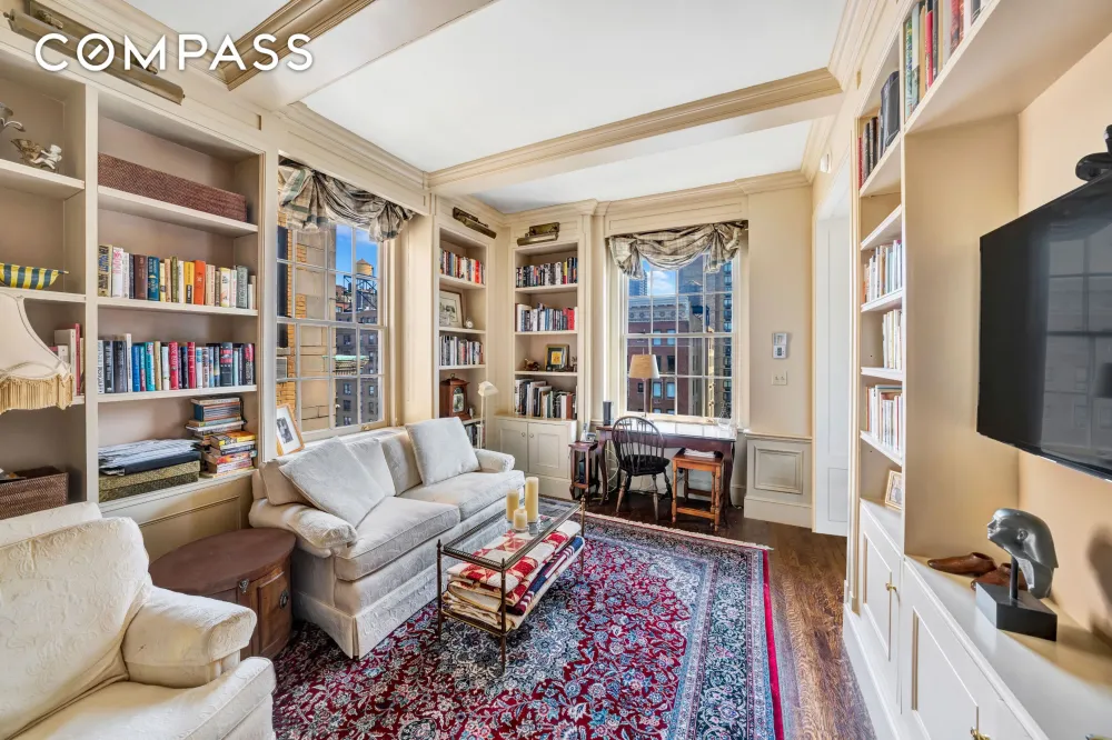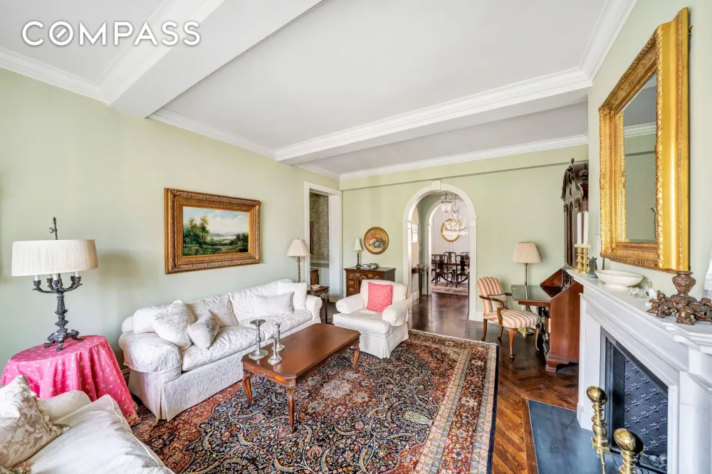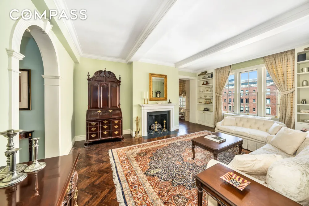 The living room is an inviting blend of elegance and warmth featuring a classic gas fireplace that exudes a cozy ambiance. Facing Park Avenue, with large windows offering stunning views of the tree-lined street below.