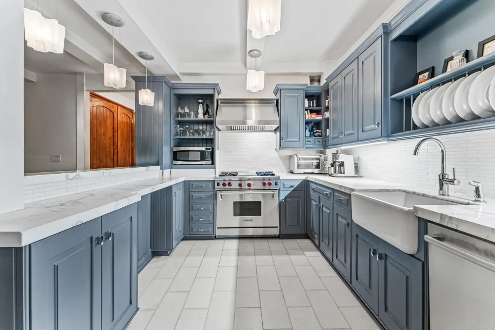 The interior of this home is an elegant showcase of high-end design. Rich hardwood floors, custom cabinetry, and marble countertops set the tone throughout. The spacious, open-concept living and dining areas are bathed in natural light, while the kitchen is outfitted with premium appliances from Sub-Zero, Wolf, and Bosch. Thoughtful details like exposed beams and pendant light fixtures further enhance the home’s refined character.