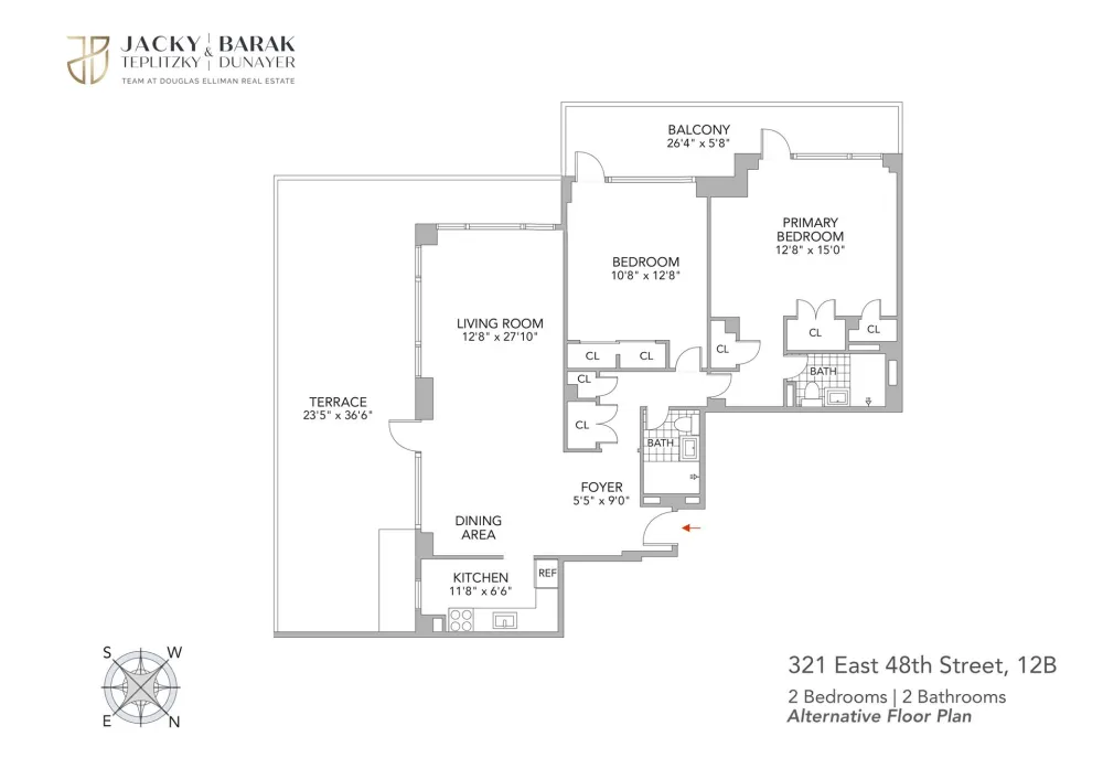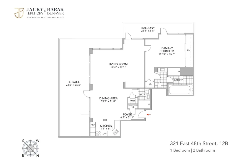 12B at The Continental Condominium is a stunning south and east-facing 2-bedroom, 2-bathroom apartment offering 1,150 SF (107 SM) of spacious living, currently configured as an expansive 1-bedroom that can easily be converted back to a 2 bedroom. This residence boasts a spectacular 600 SF wraparound terrace, providing breathtaking city views and an ideal setting for entertaining family and friends.