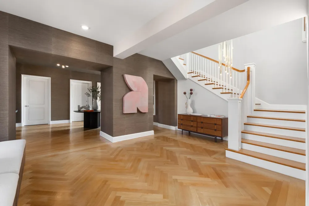Abundant natural light, grand proportions and breathtaking city views greet you upon entering from your own private keyed elevator. The foyer seamlessly transitions into the expansive living room with views overlooking Gramercy Park. The adjacent windowed formal dining room and library provide ideal spaces for entertaining. A sunny eat-in kitchen boasts elegant hand-painted cabinetry, a Wolf oven and range, a Miele dishwasher, and two Sub-Zero refrigerators. A staff room or office with a full en-suite bathroom is conveniently located behind the kitchen. Three additional bedrooms, each with en-suite marble bathrooms, and a walk-in laundry room with a side-by-side washer and dryer and sink complete the lower floor of this exceptional residence.