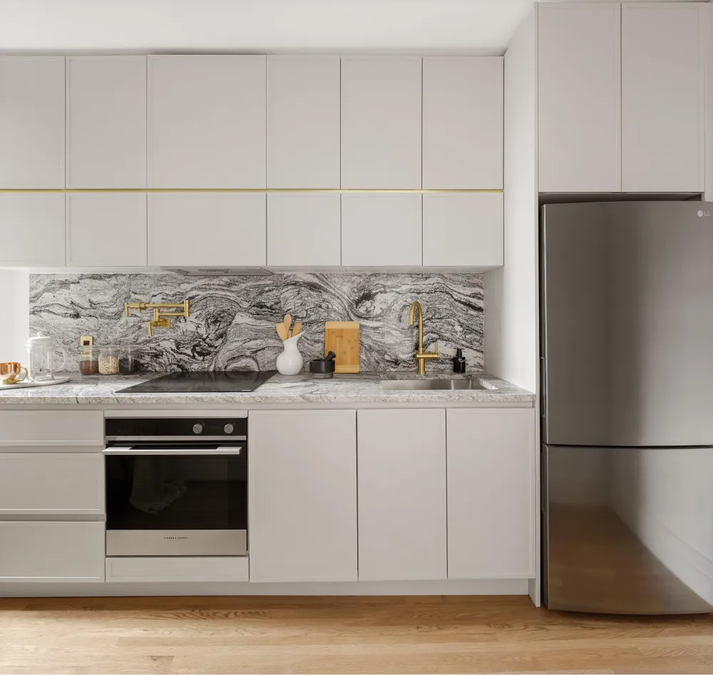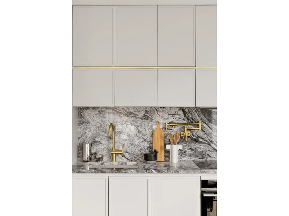 KITCHENS feature custom light grey cabinets with brushed brass accents, a natural granite countertop and backsplash, Rubinet pot-filler and faucet, Fisher & Paykel induction cooktop and oven, LG refrigerator, Bertazzoni dishwasher and a XO above-the-range hood.