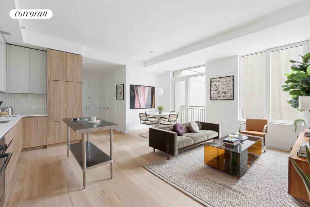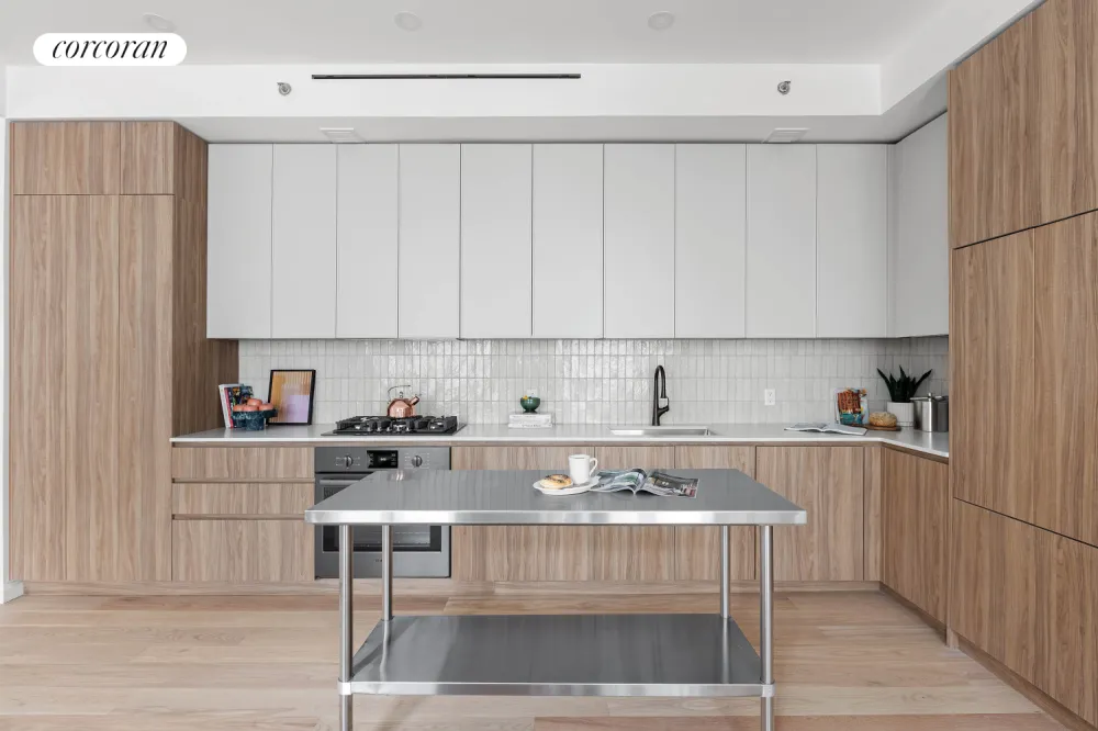 The same impressive, lush and modern aesthetic employed throughout the apartments also welcome you home every day into an impressive double-height lobby with Terrazzo floors, built-in seating, and a large package room. The Resident Lounge on this floor offers wonderful light through its corner location and includes comfortable modern furnishings, custom millwork, and large tables for working from home. Head downstairs into the wonderfully appointed fitness center that feels like a professional gym. A storage room for every unit is also located in the cellar for easy access. A common roof deck offers plantings, furniture, and an outdoor kitchen with a panoramic view of the Brooklyn skyline.