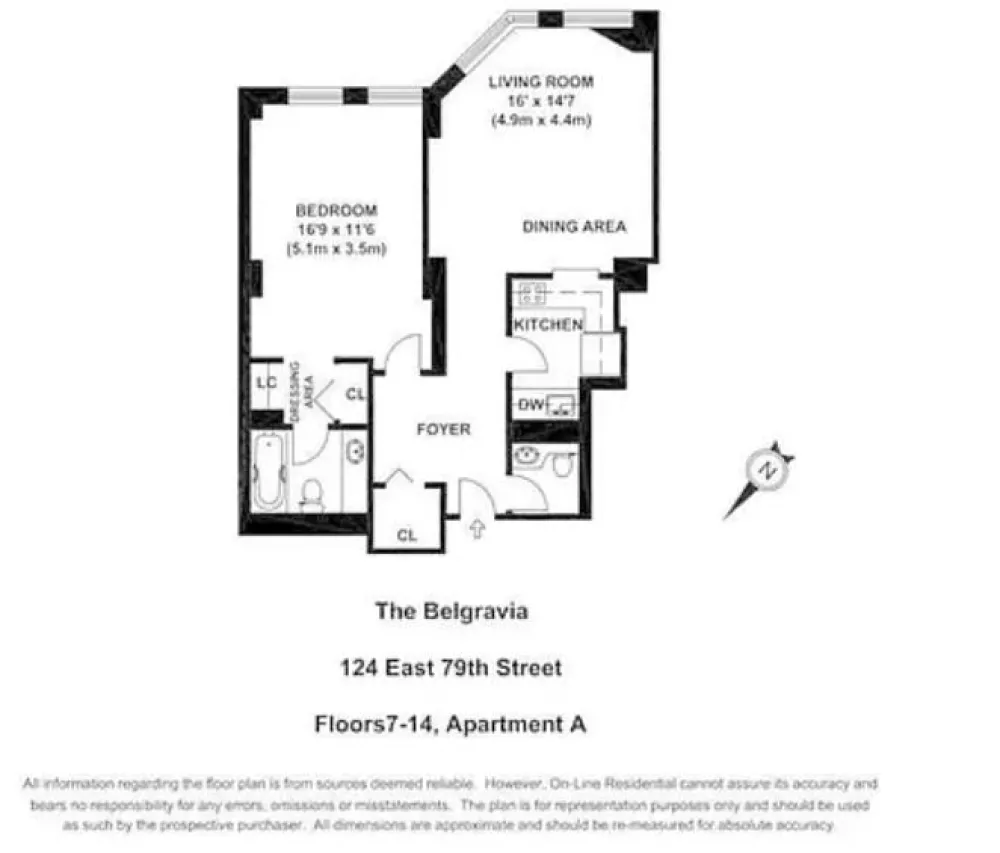 Steps away from Park Avenue. Spacious and bright one-bedroom, one-and-a-half-bathroom home is available at The Belgravia Condominium. The apartment features a partially open kitchen with updated appliances, a breakfast bar, and marble baths. There is ample storage space and a king-sized bedroom with a huge walk-in closet. The bay windows have an unobstructed city view facing northwest to the serene treetops on 79th Street. In need of TLC, bring your contractor and designer; which is presently in good original condition, to make it uniquely yours. Don’t miss the opportunity to own a piece of luxury living in one of the most sought-after neighborhoods on the Upper East Side. Please note there is an assessment in place for $152.96.