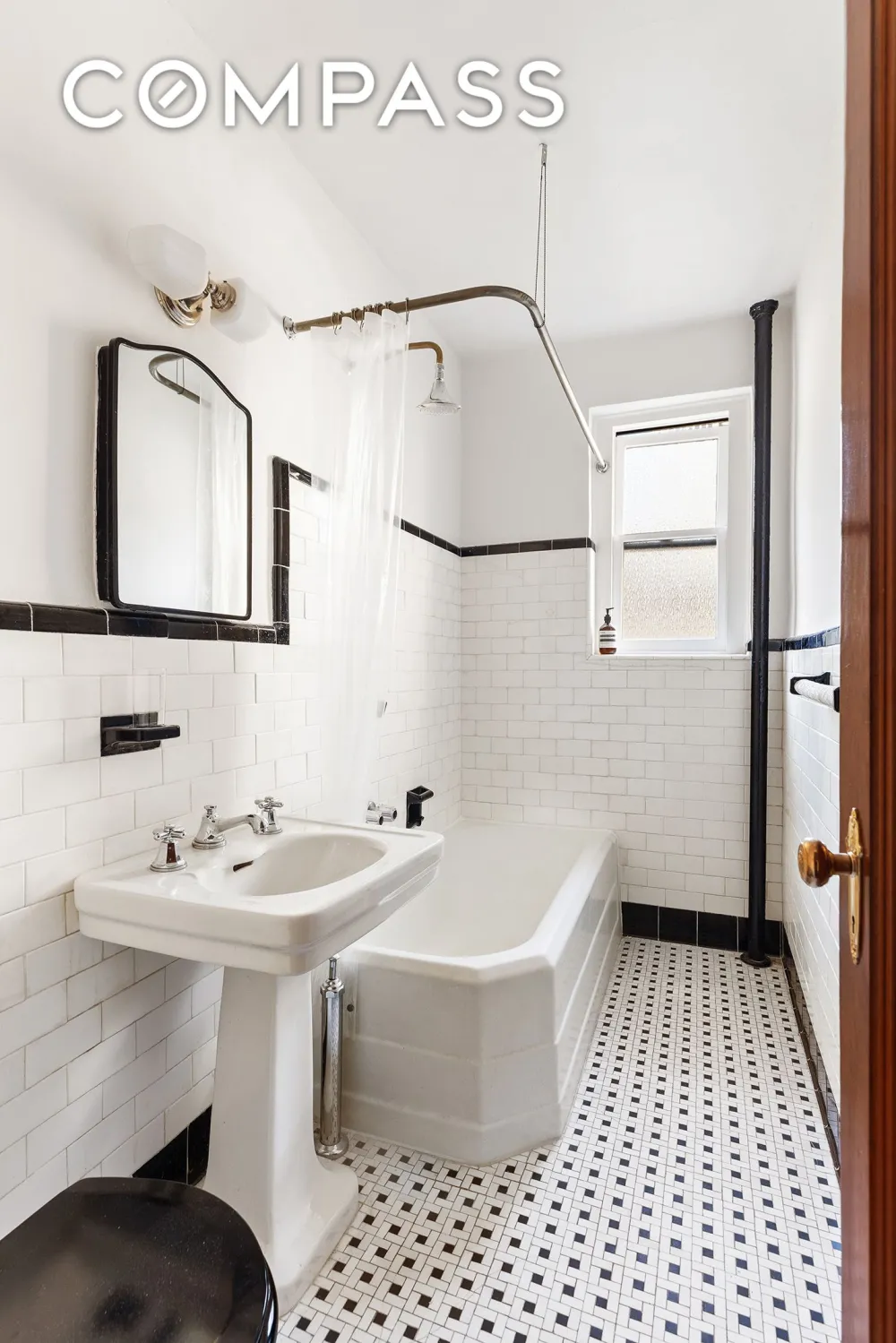 The well proportioned corner living room faces both north and west, and features large casement windows fitted for optional custom shoji screens, 8'6" ceilings, crown and picture mouldings, and a period arched entry. The king sized bedroom has dual closets, and beautifully restored solid wood doors with original brass hardware. The bright and airy kitchen has a large tilt and turn window, and crisp white cabinetry. And, the classic black and white tiled bathroom features a soaking tub and window.